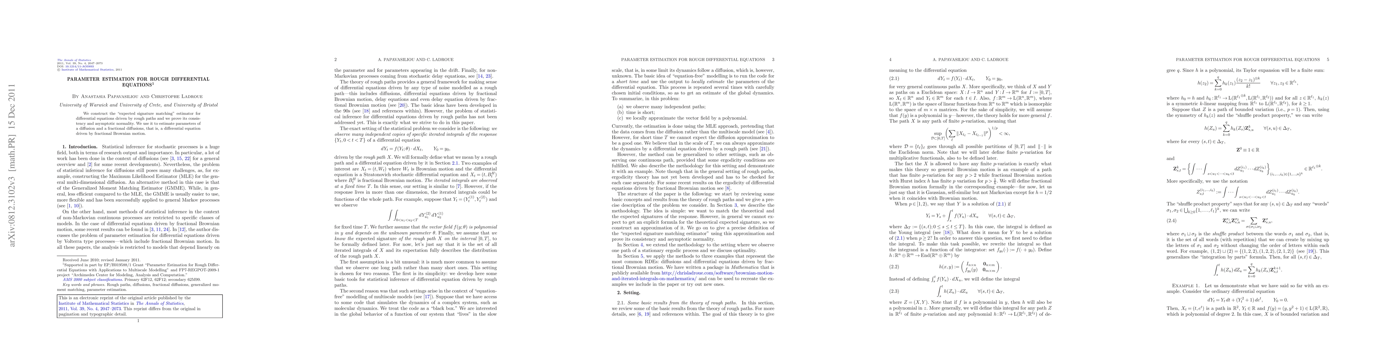 Summary: The paper introduces an "expected signature matching" estimator for rough differential equations, proving its consistency and asymptotic normality. It applies this estimator to parameter estimation in both diffusion and fractional diffusion models driven by fractional Brownian motion.