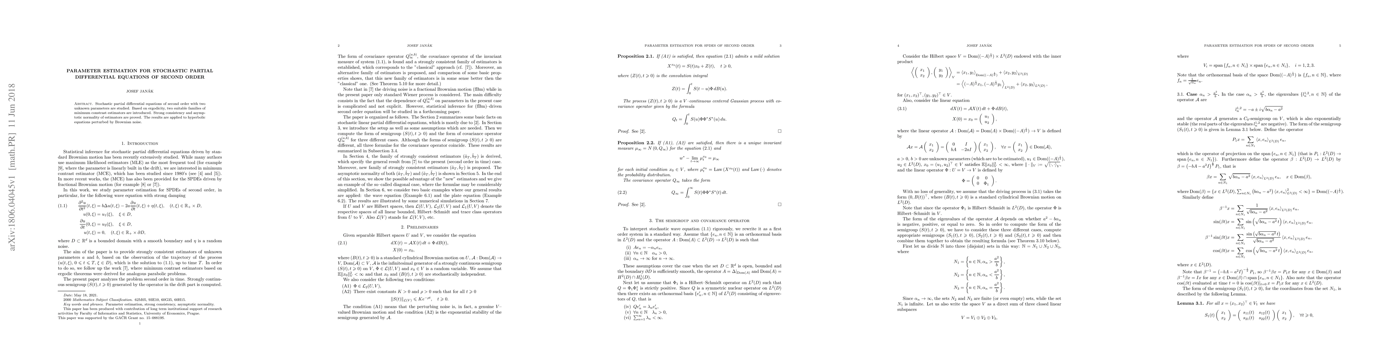 Stochastic partial differential equations of second order with two unknown parameters are studied. Based on ergodicity, two suitable families of minimum constrast estimators are introduced. Strong consistency and asymptotic normality of estimators are proved. The results are applied to hyperbolic equations perturbed by Brownian noise.