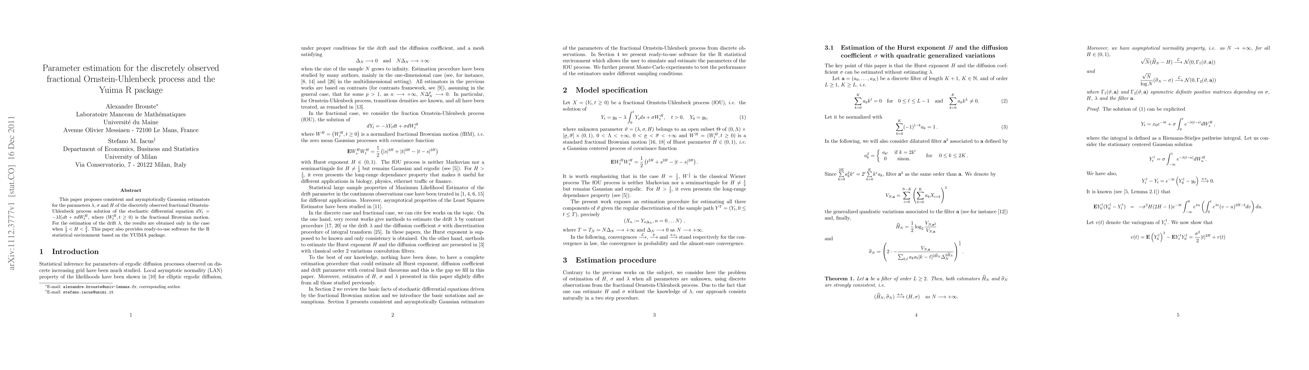 This paper proposes consistent and asymptotically Gaussian estimators for the drift, the diffusion coefficient and the Hurst exponent of the discretely observed fractional Ornstein-Uhlenbeck process. For the estimation of the drift, the results are obtained only in the case when 1/2 < H < 3/4. This paper also provides ready-to-use software for the R statistical environment based on the YUIMA package.