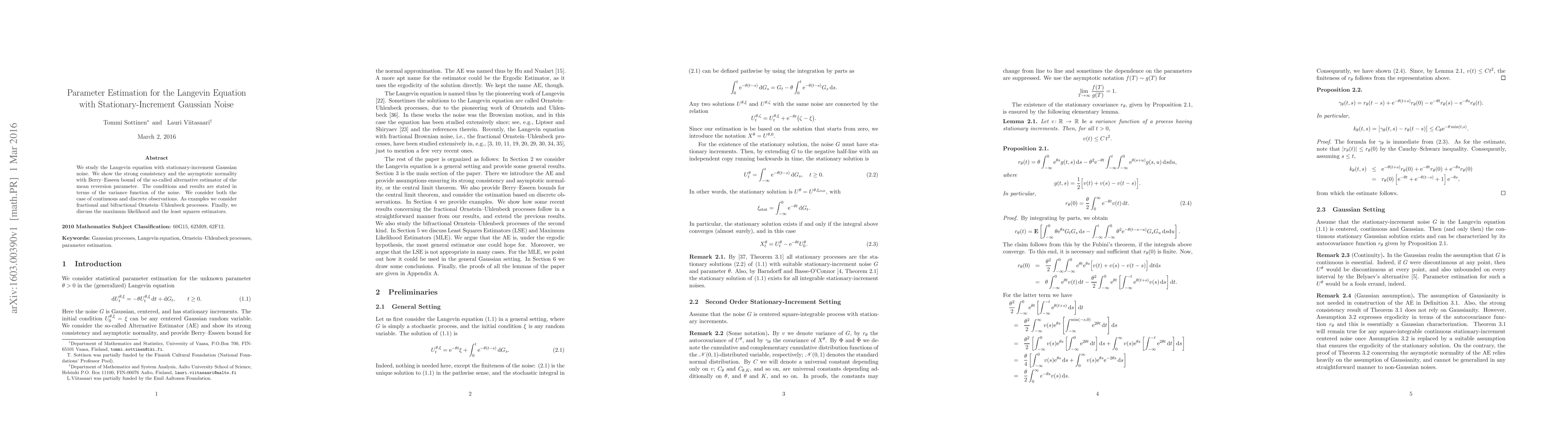 This paper investigates the Langevin equation with stationary-increment Gaussian noise, demonstrating the strong consistency and asymptotic normality of an alternative estimator for the mean reversion parameter, with a Berry-Esseen bound. It also compares this estimator with maximum likelihood and least squares methods.