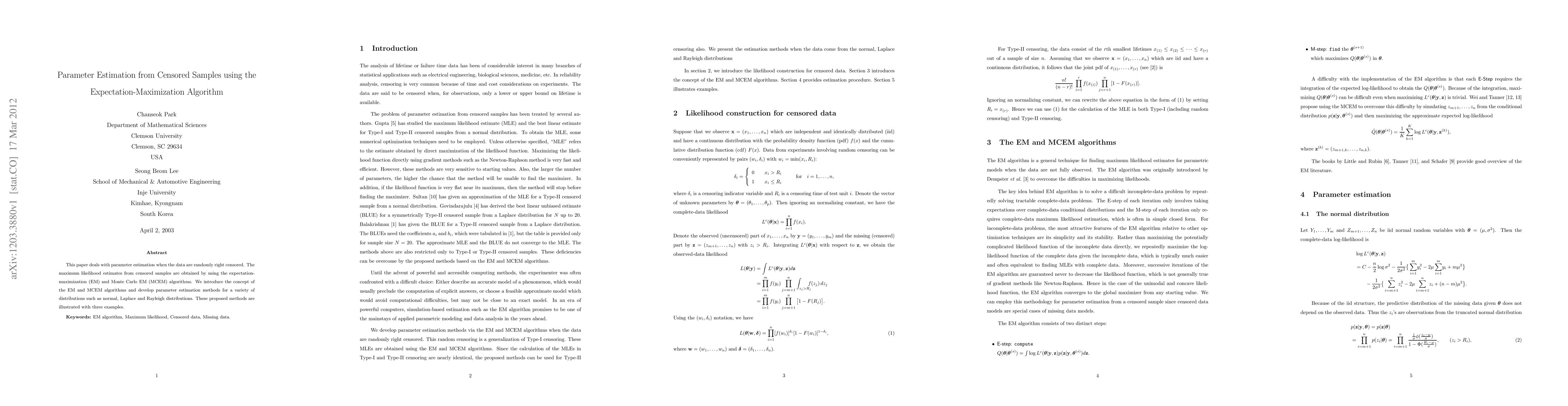 This paper presents parameter estimation techniques for censored data using the EM and MCEM algorithms, focusing on normal, Laplace, and Rayleigh distributions. The methods are demonstrated through practical examples.