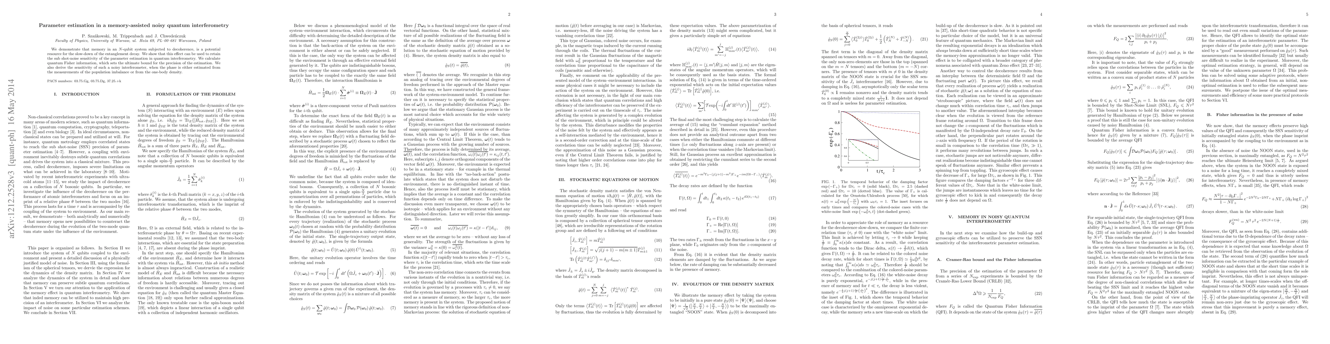 This paper explores how memory in an $N$-qubit system can slow down entanglement decay and enhance parameter estimation precision in noisy quantum interferometry, achieving sub shot-noise sensitivity. It calculates quantum Fisher information and derives the sensitivity when estimating phase from population imbalance or one-body density measurements.