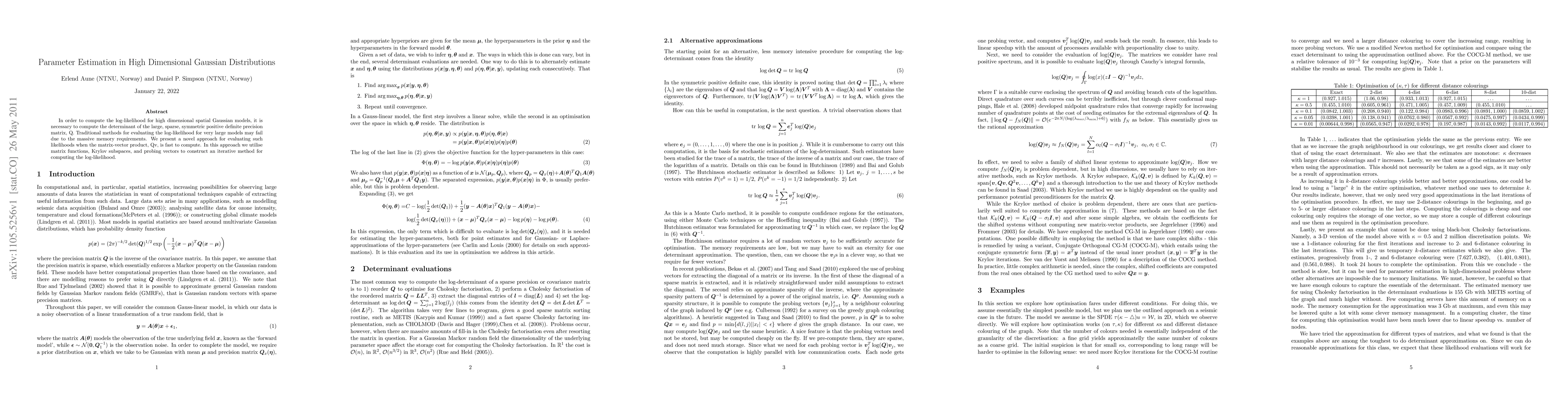 In order to compute the log-likelihood for high dimensional spatial Gaussian models, it is necessary to compute the determinant of the large, sparse, symmetric positive definite precision matrix, Q. Traditional methods for evaluating the log-likelihood for very large models may fail due to the massive memory requirements. We present a novel approach for evaluating such likelihoods when the matrix-vector product, Qv, is fast to compute. In this approach we utilise matrix functions, Krylov subspaces, and probing vectors to construct an iterative method for computing the log-likelihood.