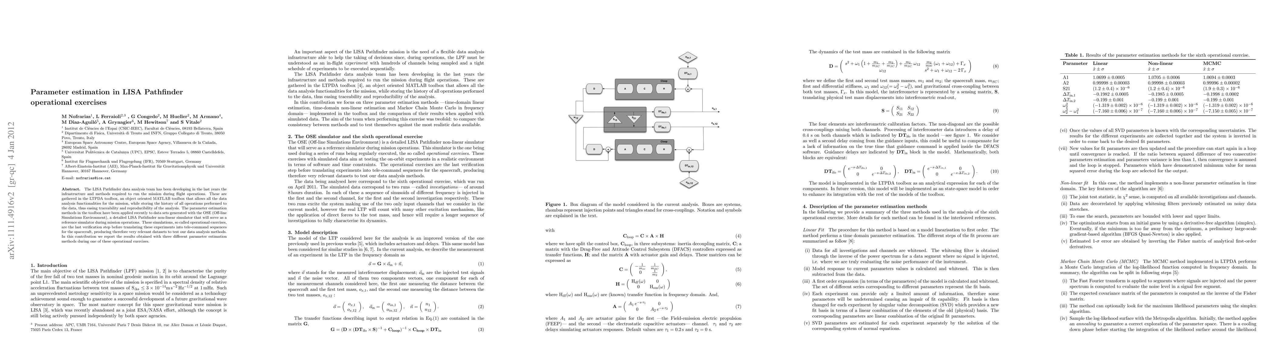 The LISA Pathfinder data analysis team has been developing in the last years the infrastructure and methods required to run the mission during flight operations. These are gathered in the LTPDA toolbox, an object oriented MATLAB toolbox that allows all the data analysis functionalities for the mission, while storing the history of all operations performed to the data, thus easing traceability and reproducibility of the analysis. The parameter estimation methods in the toolbox have been applied recently to data sets generated with the OSE (Off-line Simulations Environment), a detailed LISA Pathfinder non-linear simulator that will serve as a reference simulator during mission operations. These operational exercises aim at testing the on-orbit experiments in a realistic environment in terms of software and time constraints. These simulations, so called operational exercises, are the last verification step before translating these experiments into tele-command sequences for the spacecraft, producing therefore very relevant datasets to test our data analysis methods. In this contribution we report the results obtained with three different parameter estimation methods during one of these operational exercises.