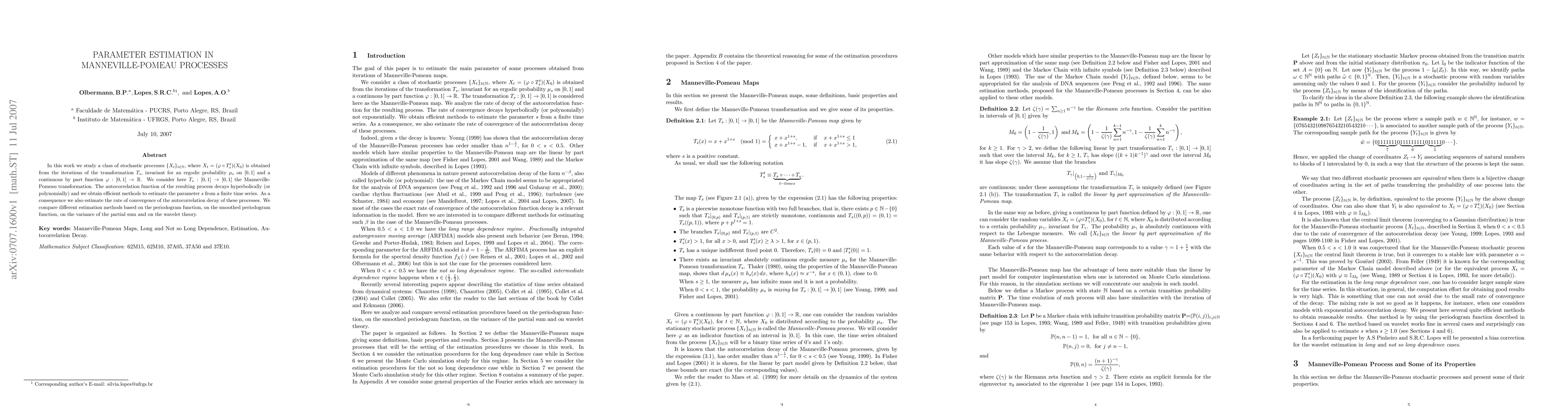 This paper investigates parameter estimation for Manneville-Pomeau processes, focusing on efficient methods to estimate the parameter s from finite time series data. It compares various estimation techniques, including periodogram, smoothed periodogram, variance of partial sums, and wavelet theory, to determine the rate of autocorrelation decay.