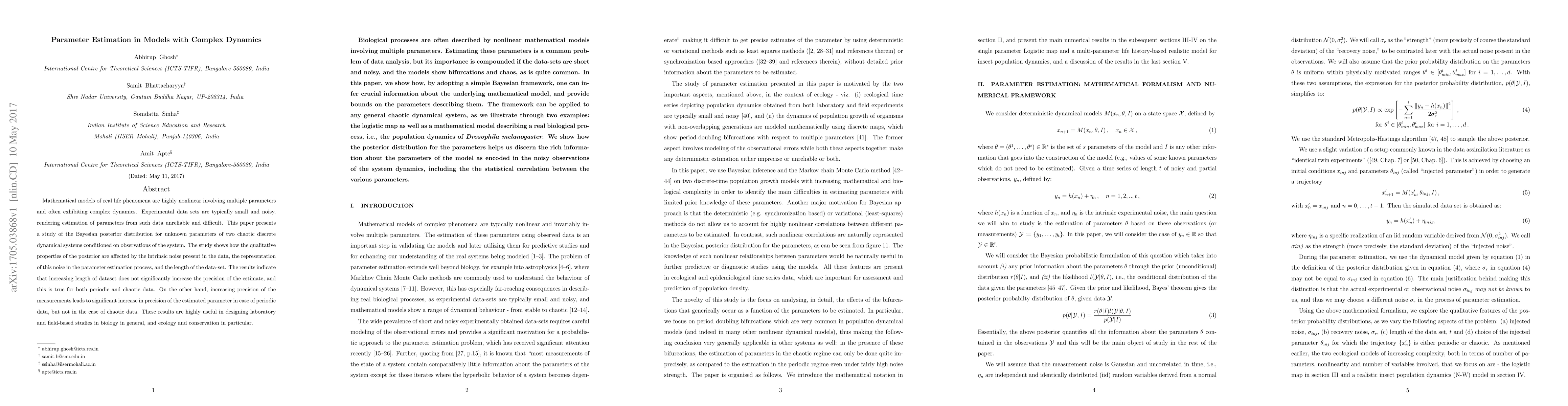 Mathematical models of real life phenomena are highly nonlinear involving multiple parameters and often exhibiting complex dynamics. Experimental data sets are typically small and noisy, rendering estimation of parameters from such data unreliable and difficult. This paper presents a study of the Bayesian posterior distribution for unknown parameters of two chaotic discrete dynamical systems conditioned on observations of the system. The study shows how the qualitative properties of the posterior are affected by the intrinsic noise present in the data, the representation of this noise in the parameter estimation process, and the length of the data-set. The results indicate that increasing length of dataset does not significantly increase the precision of the estimate, and this is true for both periodic and chaotic data. On the other hand, increasing precision of the measurements leads to significant increase in precision of the estimated parameter in case of periodic data, but not in the case of chaotic data. These results are highly useful in designing laboratory and field-based studies in biology in general, and ecology and conservation in particular.