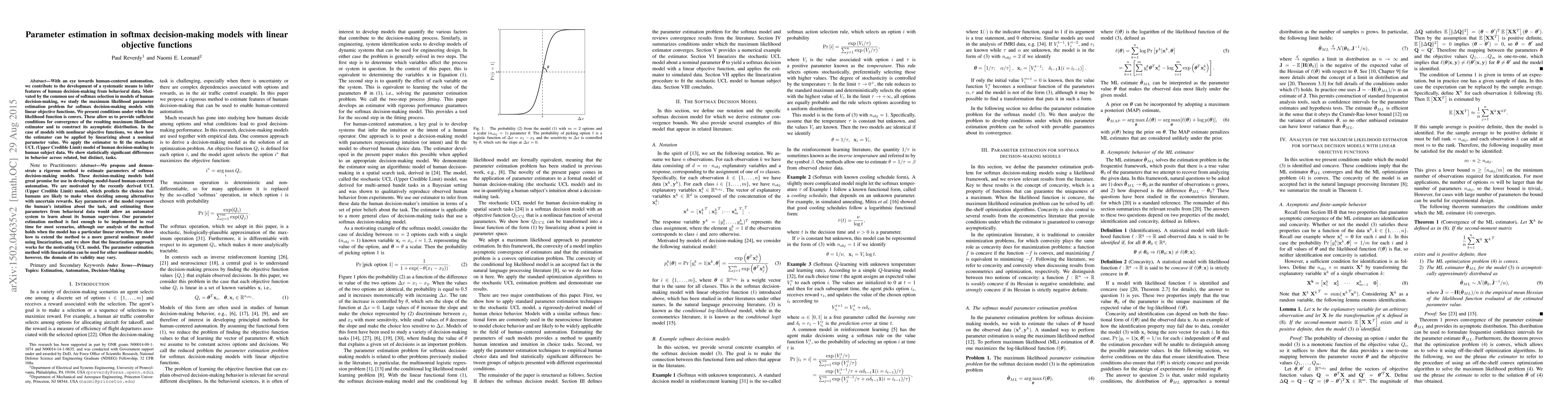 With an eye towards human-centered automation, we contribute to the development of a systematic means to infer features of human decision-making from behavioral data. Motivated by the common use of softmax selection in models of human decision-making, we study the maximum likelihood parameter estimation problem for softmax decision-making models with linear objective functions. We present conditions under which the likelihood function is convex. These allow us to provide sufficient conditions for convergence of the resulting maximum likelihood estimator and to construct its asymptotic distribution. In the case of models with nonlinear objective functions, we show how the estimator can be applied by linearizing about a nominal parameter value. We apply the estimator to fit the stochastic UCL (Upper Credible Limit) model of human decision-making to human subject data. We show statistically significant differences in behavior across related, but distinct, tasks.