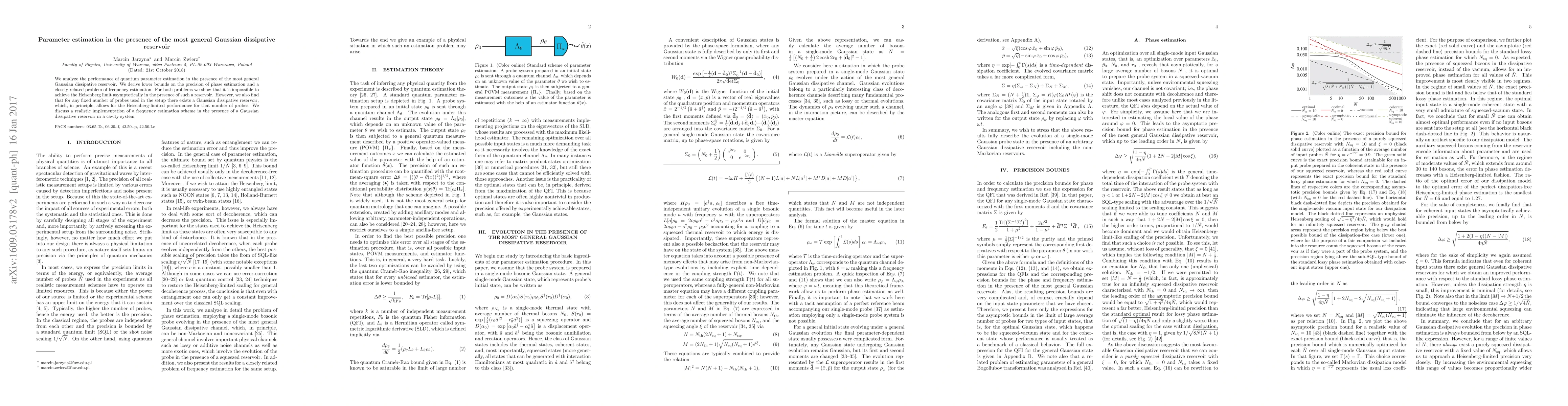 This paper investigates quantum parameter estimation under the influence of a general Gaussian dissipative reservoir, deriving lower bounds on precision for phase and frequency estimation. It concludes that achieving the Heisenberg limit asymptotically is impossible, but for a fixed number of probes, a Gaussian reservoir can allow for Heisenberg-limited performance.