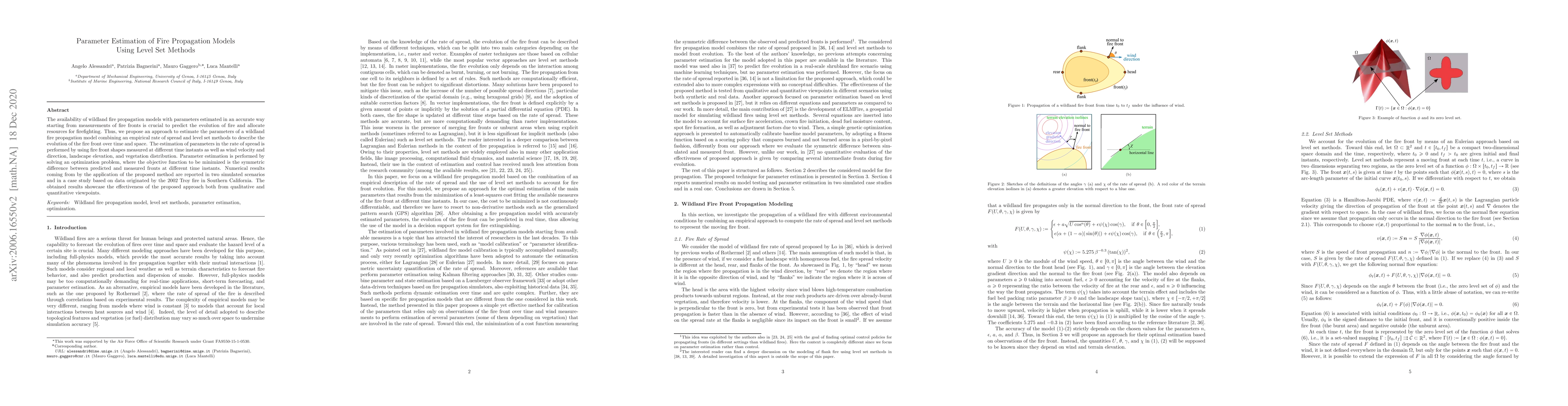 This paper proposes a method to accurately estimate parameters for wildland fire propagation models using level set methods and empirical fire spread rates. The approach optimizes the model by minimizing the difference between predicted and measured fire fronts, validated through simulated scenarios and real data from the 2002 Troy fire.