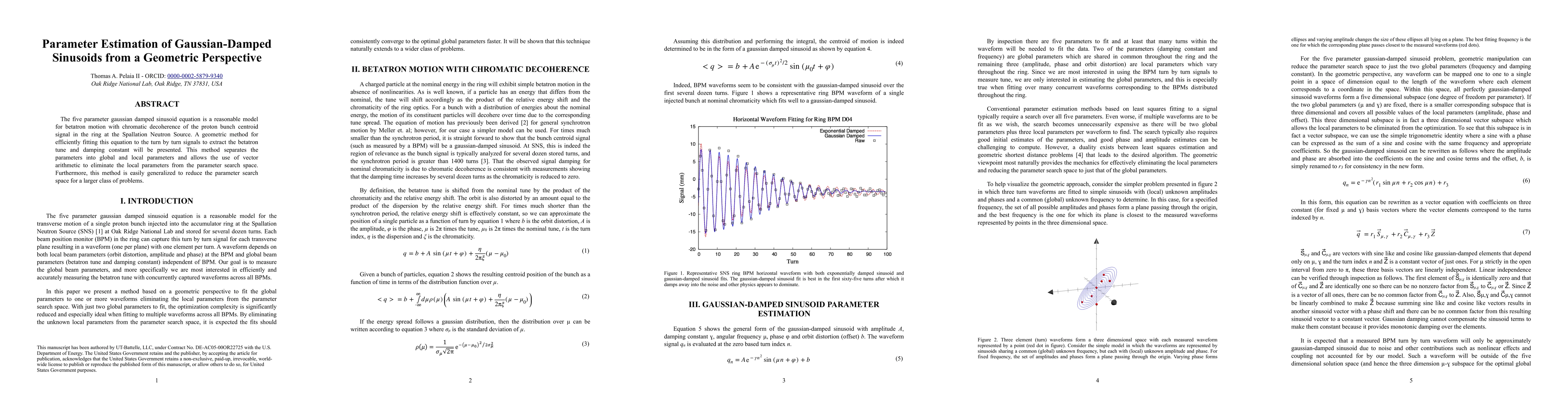 The five parameter gaussian damped sinusoid equation is a reasonable model for betatron motion with chromatic decoherence of the proton bunch centroid signal in the ring at the Spallation Neutron Source. A geometric method for efficiently fitting this equation to the turn by turn signals to extract the betatron tune and damping constant will be presented. This method separates the parameters into global and local parameters and allows the use of vector arithmetic to eliminate the local parameters from the parameter search space. Furthermore, this method is easily generalized to reduce the parameter search space for a larger class of problems.