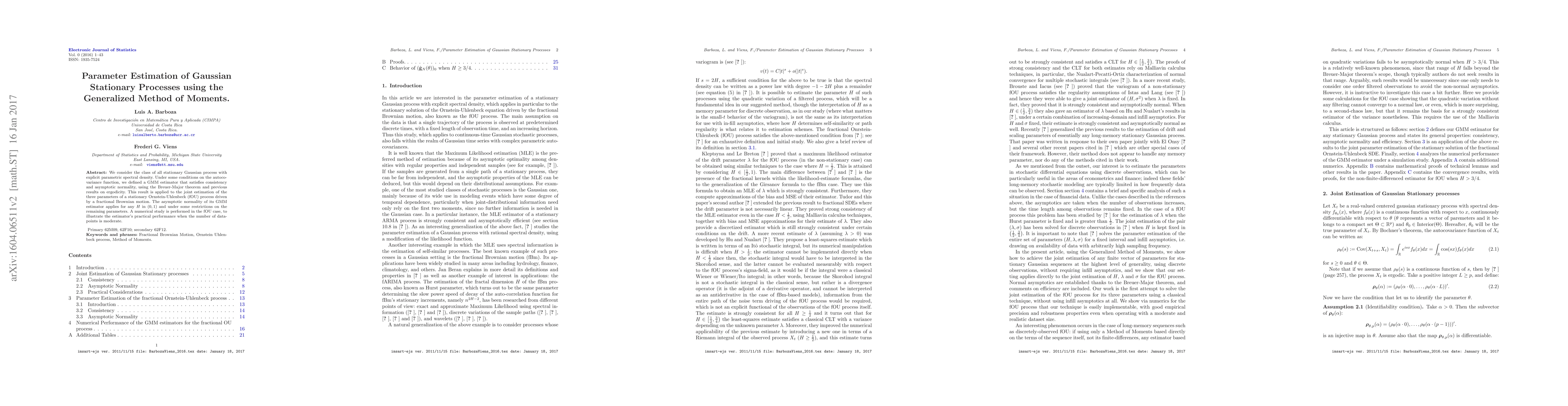 A new method for estimating parameters in Gaussian stationary processes has been developed, which provides consistent and asymptotically normal results for the estimation of a specific type of process, including the Ornstein-Uhlenbeck process driven by fractional Brownian motion.