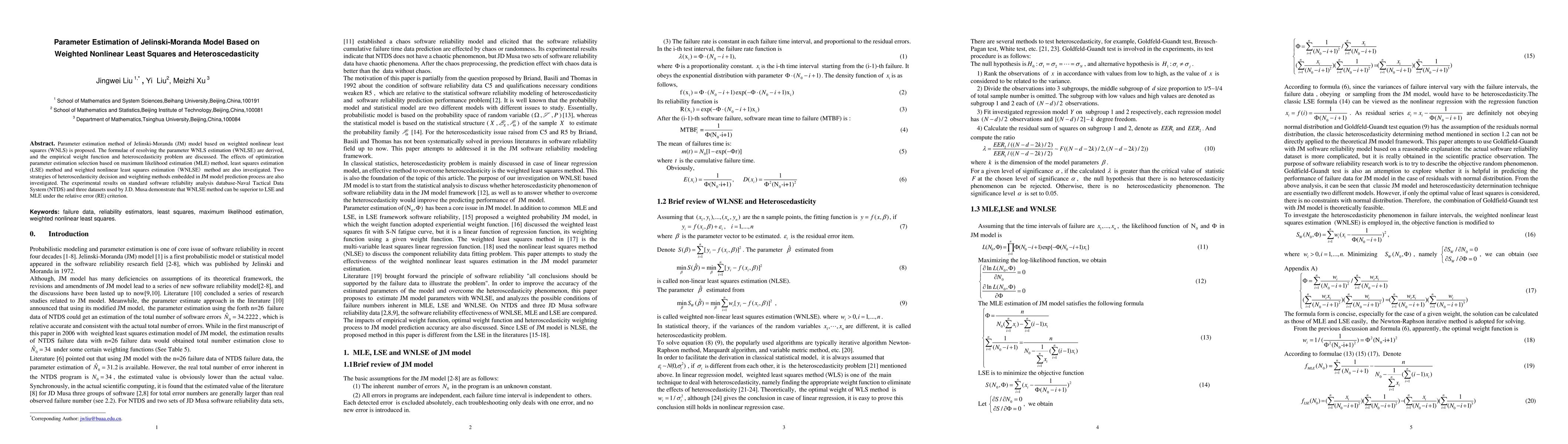 This paper proposes a parameter estimation method for the Jelinski-Moranda model using weighted nonlinear least squares (WNLS) and addresses heteroscedasticity issues. Experimental results show that the WNLS method outperforms least squares and maximum likelihood estimation methods in terms of relative error on standard software reliability datasets.