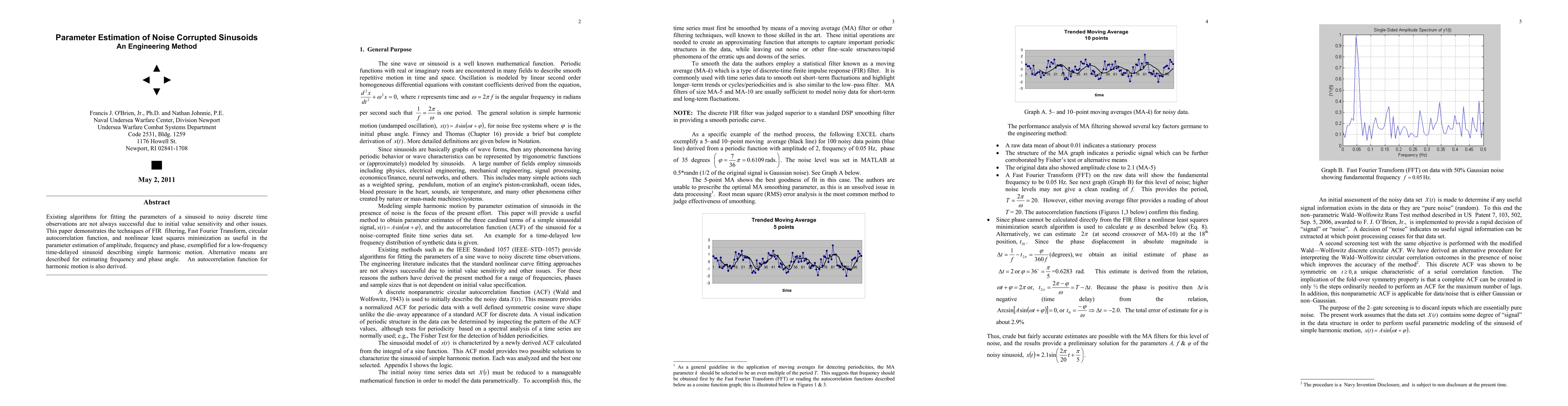 Researchers developed methods to accurately estimate parameters of sinusoids in noisy data, including amplitude, frequency, and phase, using techniques like filtering and non-linear least squares minimization.