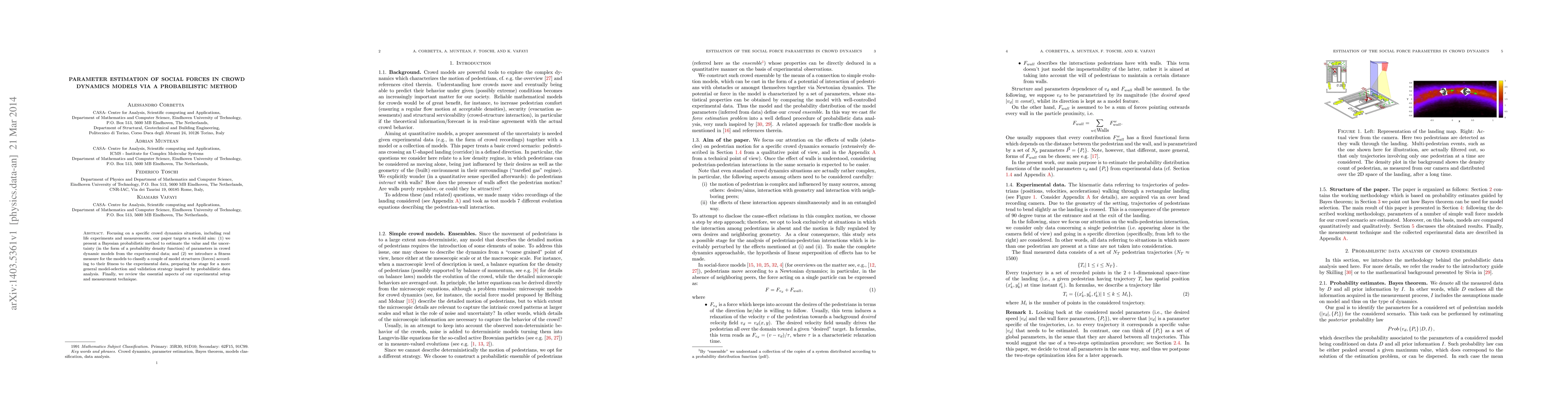 Focusing on a specific crowd dynamics situation, including real life experiments and measurements, our paper targets a twofold aim: (1) we present a Bayesian probabilistic method to estimate the value and the uncertainty (in the form of a probability density function) of parameters in crowd dynamic models from the experimental data; and (2) we introduce a fitness measure for the models to classify a couple of model structures (forces) according to their fitness to the experimental data, preparing the stage for a more general model-selection and validation strategy inspired by probabilistic data analysis. Finally, we review the essential aspects of our experimental setup and measurement technique.