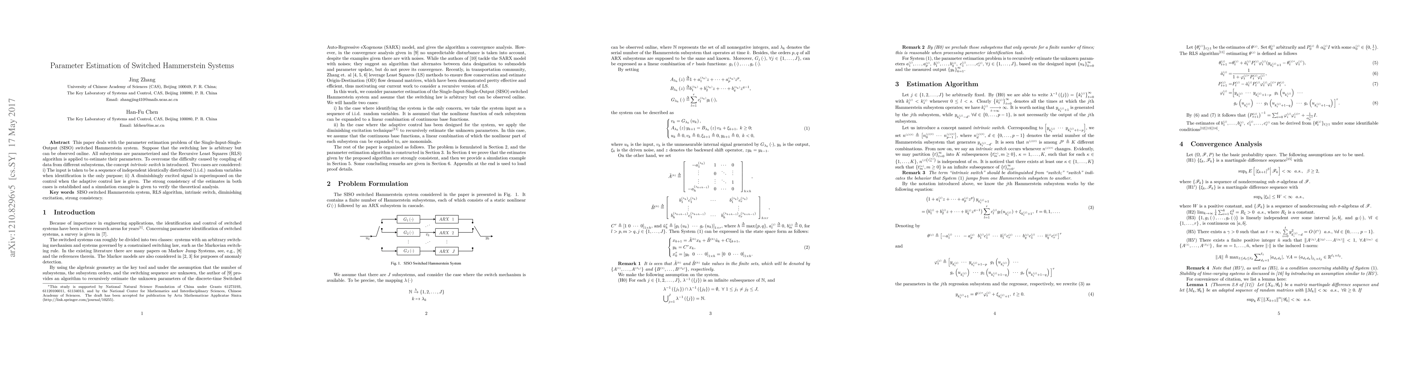 This paper deals with the parameter estimation problem of the Single-Input-Single-Output (SISO) switched Hammerstein system. Suppose that the switching law is arbitrary but can be observed online. All subsystems are parameterized and the Recursive Least Squares (RLS) algorithm is applied to estimate their parameters. To overcome the difficulty caused by coupling of data from different subsystems, the concept "intrinsic switch" is introduced. Two cases are considered: i) The input is taken to be a sequence of independent identically distributed (i.i.d.) random variables when identification is the only purpose; ii) A diminishingly excited signal is superimposed on the control when the adaptive control law is given. The strong consistency of the estimates in both cases is established and a simulation example is given to verify the theoretical analysis.