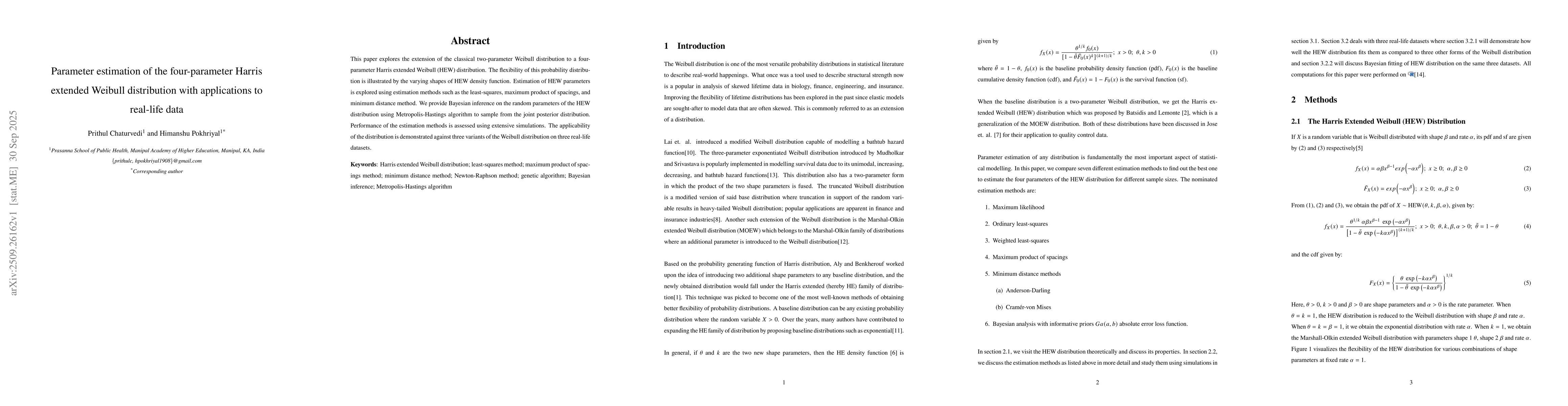 The paper extends the two-parameter Weibull distribution to a four-parameter Harris extended Weibull (HEW) distribution. It employs estimation methods such as least-squares, maximum product of spacings, minimum distance, and Bayesian inference using Metropolis-Hastings algorithm. Simulations and real-life datasets are used to evaluate performance and applicability.
