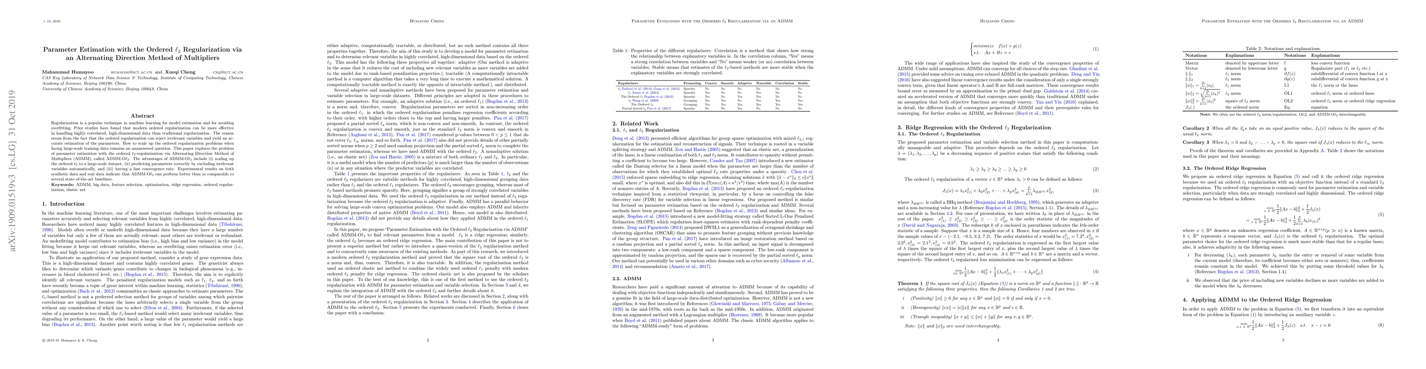 This paper proposes ADMM-O$\ell_{2}$ for parameter estimation using ordered $\ell_{2}$ regularization, addressing scalability for large-scale data. It demonstrates improved performance over traditional methods by effectively excluding irrelevant variables and achieving fast convergence.