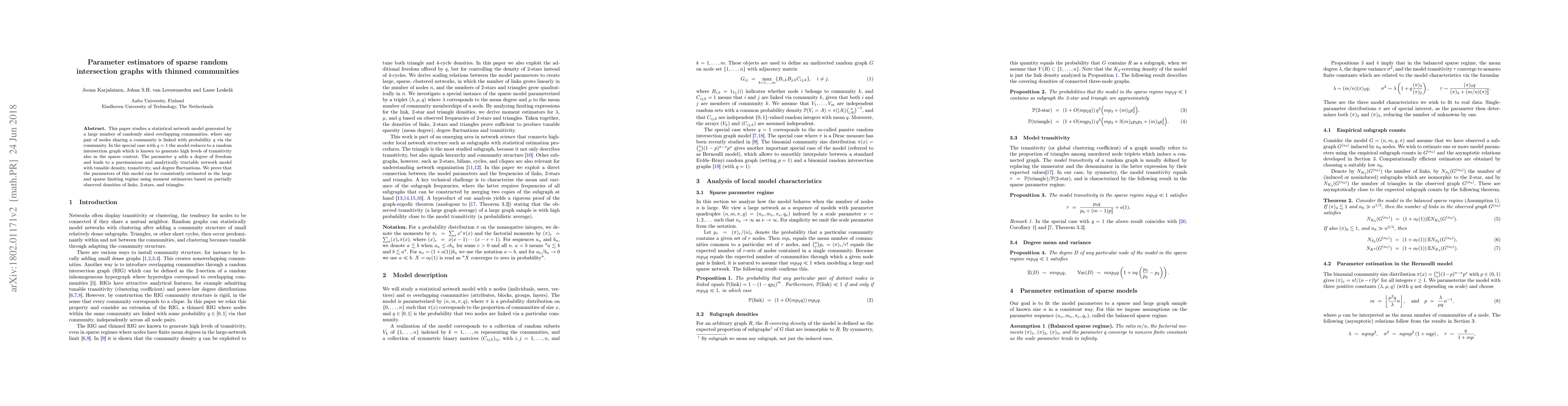 This paper studies a statistical network model generated by a large number of randomly sized overlapping communities, where any pair of nodes sharing a community is linked with probability $q$ via the community. In the special case with $q=1$ the model reduces to a random intersection graph which is known to generate high levels of transitivity also in the sparse context. The parameter $q$ adds a degree of freedom and leads to a parsimonious and analytically tractable network model with tunable density, transitivity, and degree fluctuations. We prove that the parameters of this model can be consistently estimated in the large and sparse limiting regime using moment estimators based on partially observed densities of links, 2-stars, and triangles.