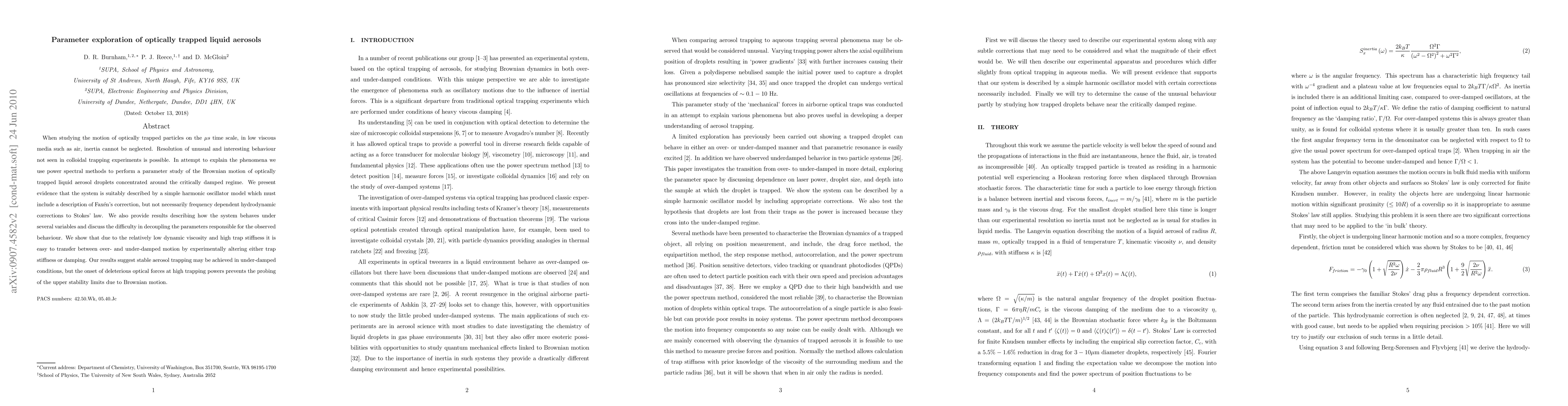 When studying the motion of optically trapped particles on the $\mu s$ time scale, in low viscous media such as air, inertia cannot be neglected. Resolution of unusual and interesting behaviour not seen in colloidal trapping experiments is possible. In attempt to explain the phenomena we use power spectral methods to perform a parameter study of the Brownian motion of optically trapped liquid aerosol droplets concentrated around the critically damped regime. We present evidence that the system is suitably described by a simple harmonic oscillator model which must include a description of Fax\'{e}n's correction, but not necessarily frequency dependent hydrodynamic corrections to Stokes' law. We also provide results describing how the system behaves under several variables and discuss the difficulty in decoupling the parameters responsible for the observed behaviour. We show that due to the relatively low dynamic viscosity and high trap stiffness it is easy to transfer between over- and under-damped motion by experimentally altering either trap stiffness or damping. Our results suggest stable aerosol trapping may be achieved in under-damped conditions, but the onset of deleterious optical forces at high trapping powers prevents the probing of the upper stability limits due to Brownian motion.
