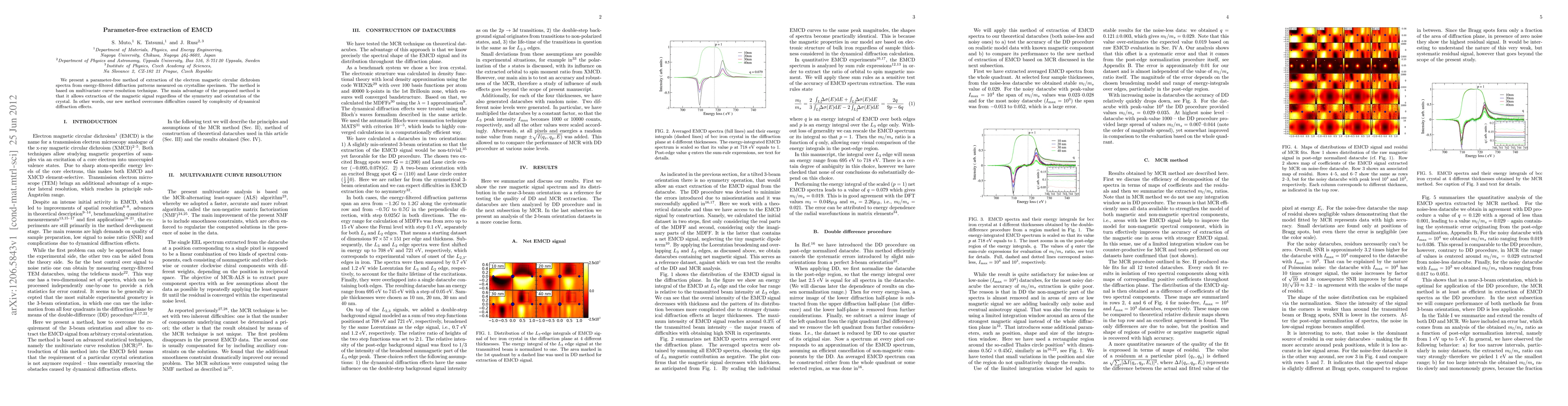 We present a parameter-free method of extraction of the electron magnetic circular dichroism spectra from energy-filtered diffraction patterns measured on crystalline specimen. The method is based on multivariate curve resolution technique. The main advantage of the proposed method is that it allows extraction of the magnetic signal regardless of the symmetry and orientation of the crystal. In other words, our new method overcomes difficulties caused by complexity of dynamical diffraction effects.