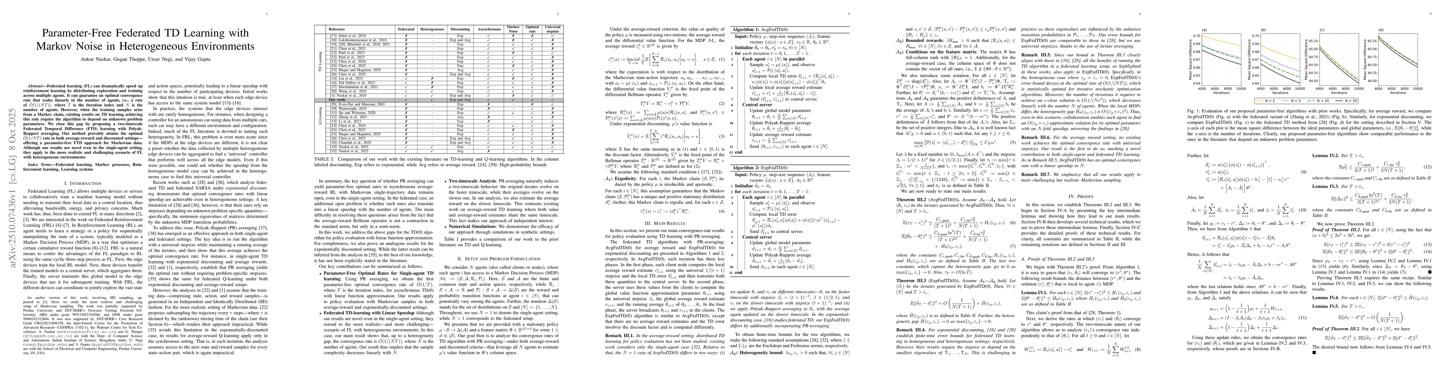 Federated learning (FL) can dramatically speed up reinforcement learning by distributing exploration and training across multiple agents. It can guarantee an optimal convergence rate that scales linearly in the number of agents, i.e., a rate of $\tilde{O}(1/(NT)),$ where $T$ is the iteration index and $N$ is the number of agents. However, when the training samples arise from a Markov chain, existing results on TD learning achieving this rate require the algorithm to depend on unknown problem parameters. We close this gap by proposing a two-timescale Federated Temporal Difference (FTD) learning with Polyak-Ruppert averaging. Our method provably attains the optimal $\tilde{O}(1/NT)$ rate in both average-reward and discounted settings--offering a parameter-free FTD approach for Markovian data. Although our results are novel even in the single-agent setting, they apply to the more realistic and challenging scenario of FL with heterogeneous environments.