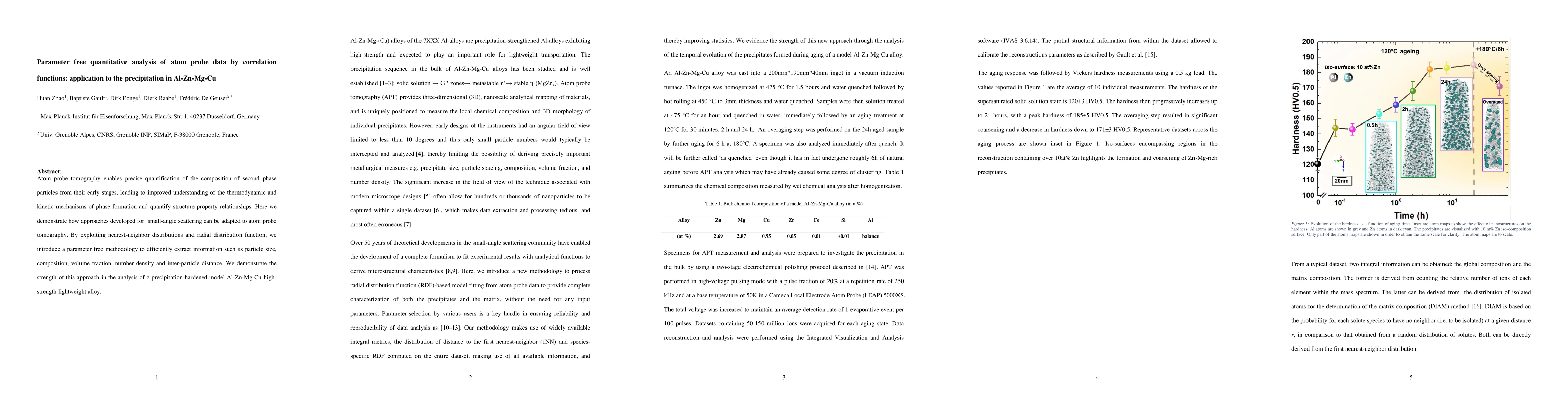 This paper presents a parameter-free quantitative analysis method for atom probe data using correlation functions, adapting techniques from small-angle scattering. The method extracts detailed information on particle size, composition, and inter-particle distances, demonstrated effectively on an Al-Zn-Mg-Cu alloy.