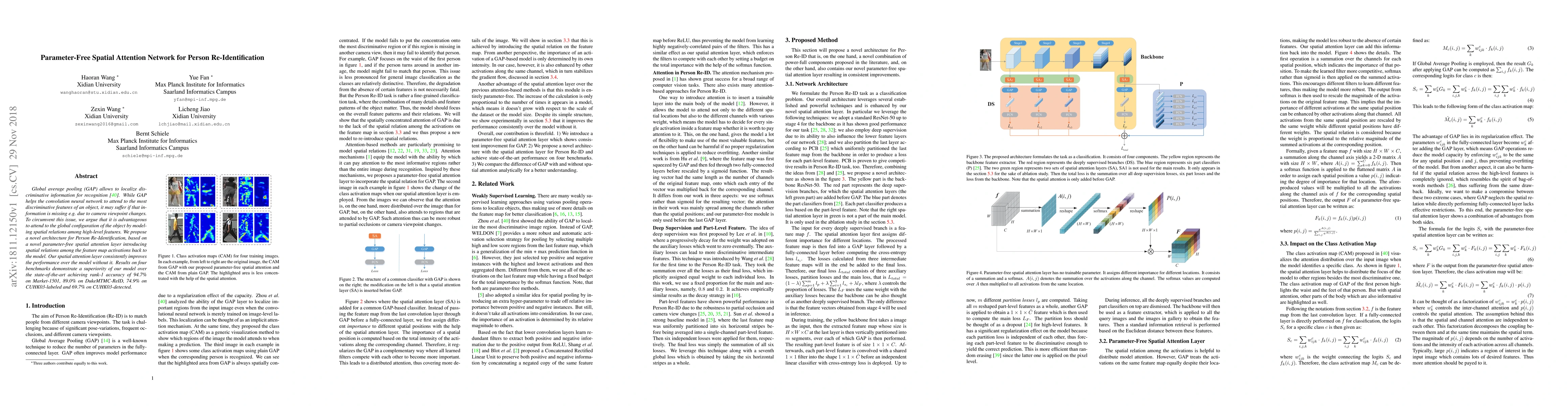Global average pooling (GAP) allows to localize discriminative information for recognition [40]. While GAP helps the convolution neural network to attend to the most discriminative features of an object, it may suffer if that information is missing e.g. due to camera viewpoint changes. To circumvent this issue, we argue that it is advantageous to attend to the global configuration of the object by modeling spatial relations among high-level features. We propose a novel architecture for Person Re-Identification, based on a novel parameter-free spatial attention layer introducing spatial relations among the feature map activations back to the model. Our spatial attention layer consistently improves the performance over the model without it. Results on four benchmarks demonstrate a superiority of our model over the state-of-the-art achieving rank-1 accuracy of 94.7% on Market-1501, 89.0% on DukeMTMC-ReID, 74.9% on CUHK03-labeled and 69.7% on CUHK03-detected.