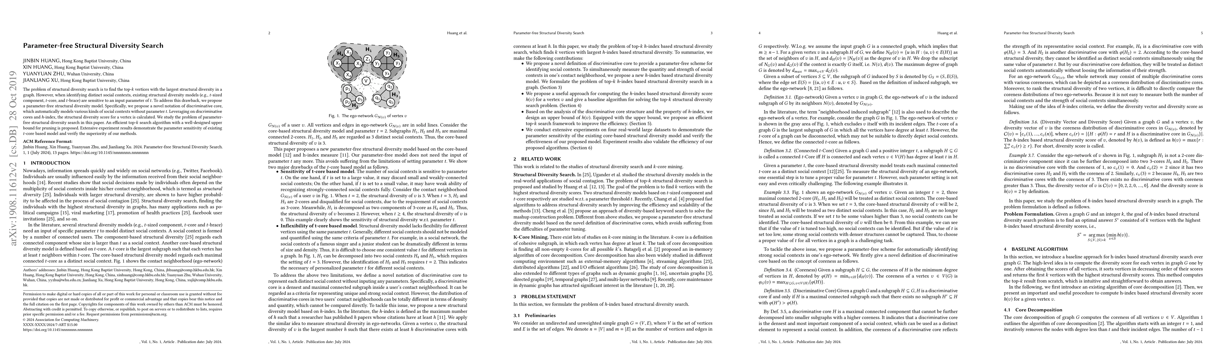 This paper proposes a parameter-free structural diversity model called discriminative core to identify top-k vertices with the largest structural diversity in a graph, eliminating the need for an input parameter t. An efficient algorithm is developed for this purpose, and experiments show its superiority over existing t-core based models.