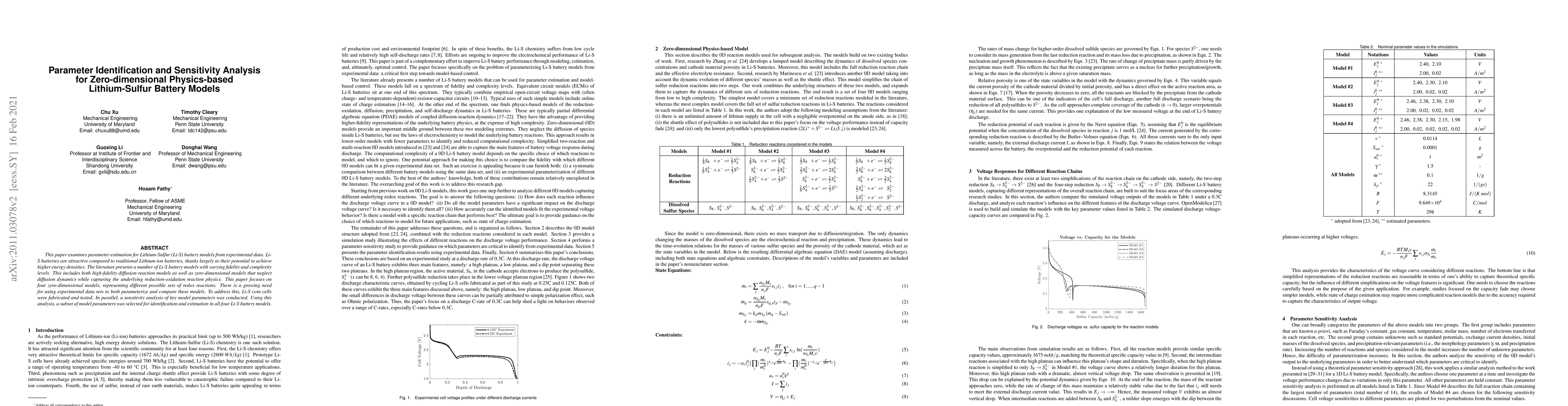 This paper examines the problem of estimating the parameters of a Lithium-Sulfur (LiS) battery from experimental cycling data. LiS batteries are attractive compared to traditional Lithium-Ion batteries, thanks largely to their potential to provide higher energy densities. The literature presents a number of different LiS battery models, with different fidelities and complexities. This includes both higher-fidelity diffusion-reaction models as well as "zero-dimensional" models that neglect diffusion dynamics while capturing the physics of the underlying reduction-oxidation reactions. The paper focuses on zero-dimensional LiS battery models, and develops four such models from the literature, reflecting different choices of which redox reactions to model. There is a growing need for using experimental cycling datasets to both parameterize these models and compare their fidelities. To address this need, we fabricated LiS coin cells and performed charge/discharge cycling tests on these cells. In parallel, we analyzed the sensitivity of simulated LiS battery charge/discharge characteristics to underlying model parameters. Using this sensitivity analysis, we selected a subset of model parameters for identification, and estimated these parameters for all four LiS battery models from cycling data, thereby arriving at a consistent experimental comparison and assessment of these models' respective fidelities.