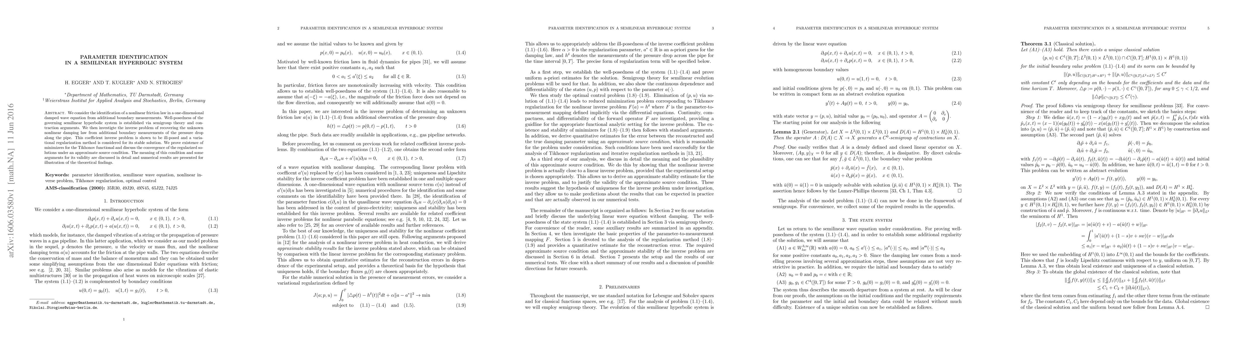 We consider the identification of a nonlinear friction law in a one-dimensional damped wave equation from additional boundary measurements. Well-posedness of the governing semilinear hyperbolic system is established via semigroup theory and contraction arguments. We then investigte the inverse problem of recovering the unknown nonlinear damping law from additional boundary measurements of the pressure drop along the pipe. This coefficient inverse problem is shown to be ill-posed and a variational regularization method is considered for its stable solution. We prove existence of minimizers for the Tikhonov functional and discuss the convergence of the regularized solutions under an approximate source condition. The meaning of this condition and some arguments for its validity are discussed in detail and numerical results are presented for illustration of the theoretical findings.