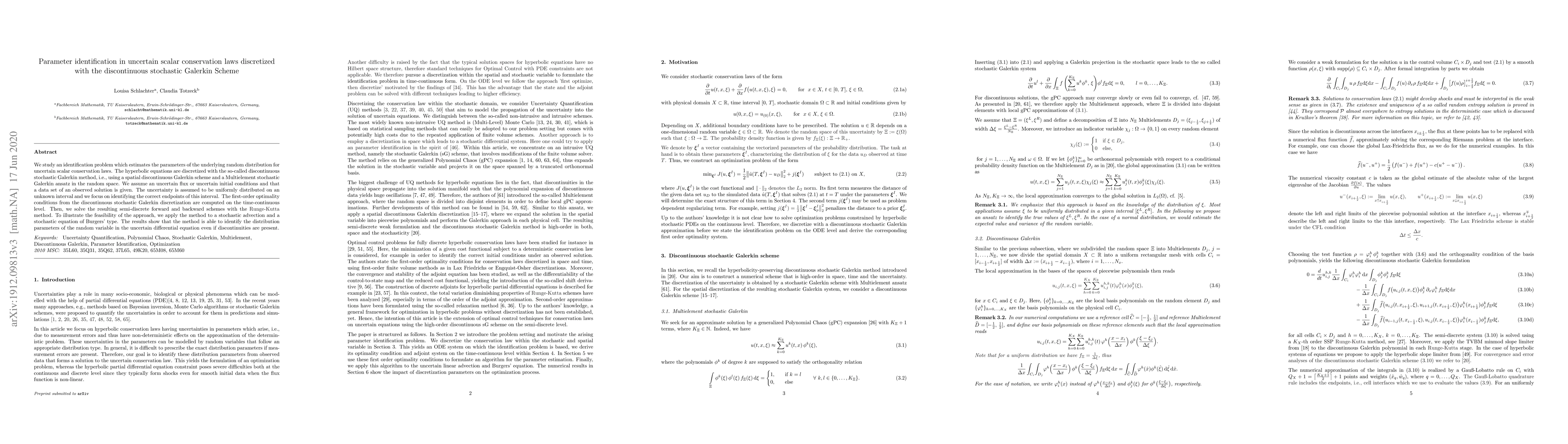 This paper proposes a method to identify parameters of uncertain scalar conservation laws using the discontinuous stochastic Galerkin scheme, demonstrating its effectiveness through simulations of stochastic advection and Burgers' equations. The approach successfully identifies the endpoints of an uncertain uniformly distributed interval.