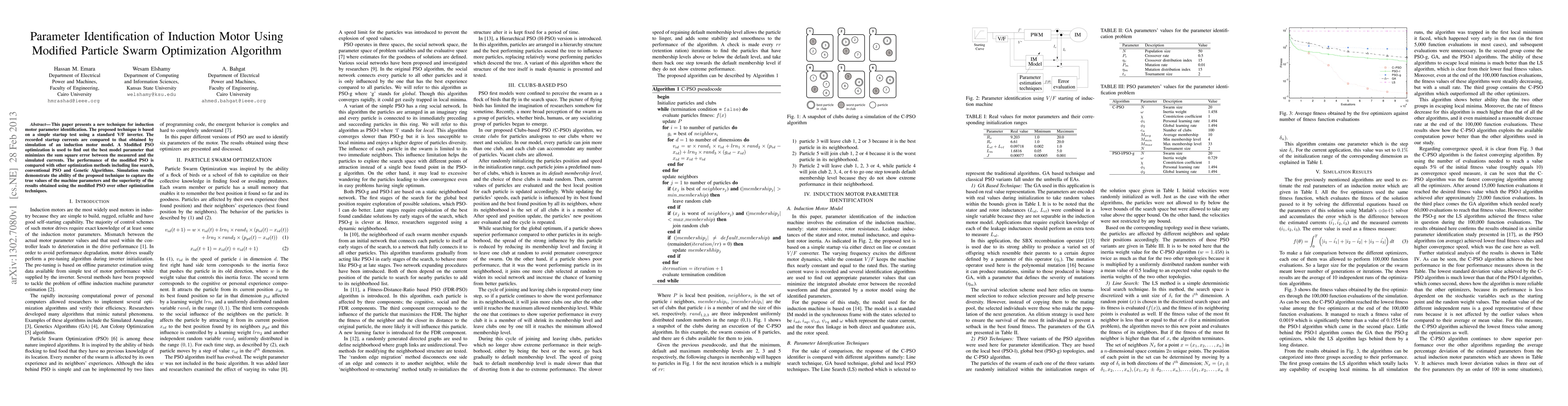 This paper introduces a new method for identifying induction motor parameters using a modified Particle Swarm Optimization (PSO) algorithm, which outperforms other optimization techniques like line search, conventional PSO, and Genetic Algorithms. The technique minimizes the error between measured and simulated startup currents, demonstrating superior accuracy in parameter identification.