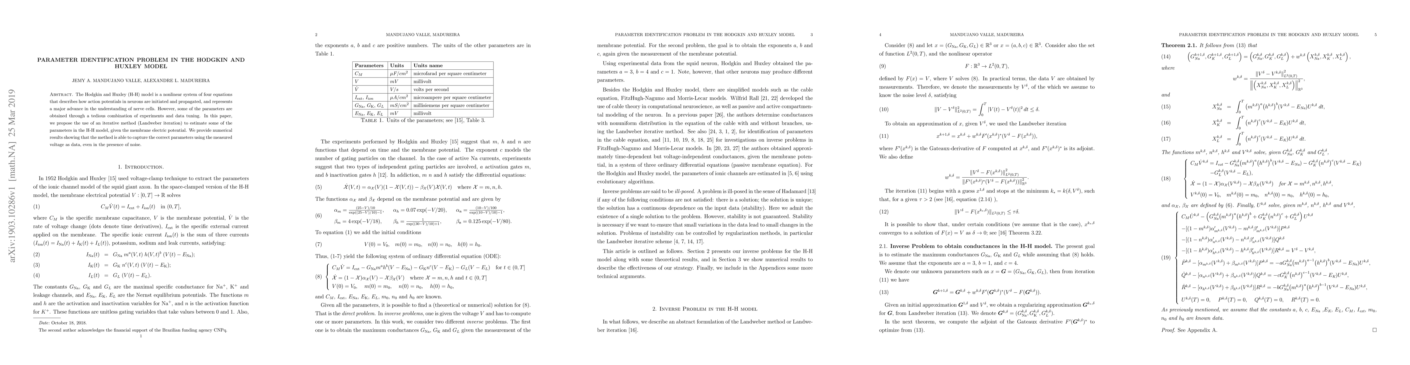 The Hodgkin and Huxley (H-H) model is a nonlinear system of four equations that describes how action potentials in neurons are initiated and propagated, and represents a major advance in the understanding of nerve cells. However, some of the parameters are obtained through a tedious combination of experiments and data tuning. In this paper, we propose the use of an iterative method (Landweber iteration) to estimate some of the parameters in the H-H model, given the membrane electric potential. We provide numerical results showing that the method is able to capture the correct parameters using the measured voltage as data, even in the presence of noise.