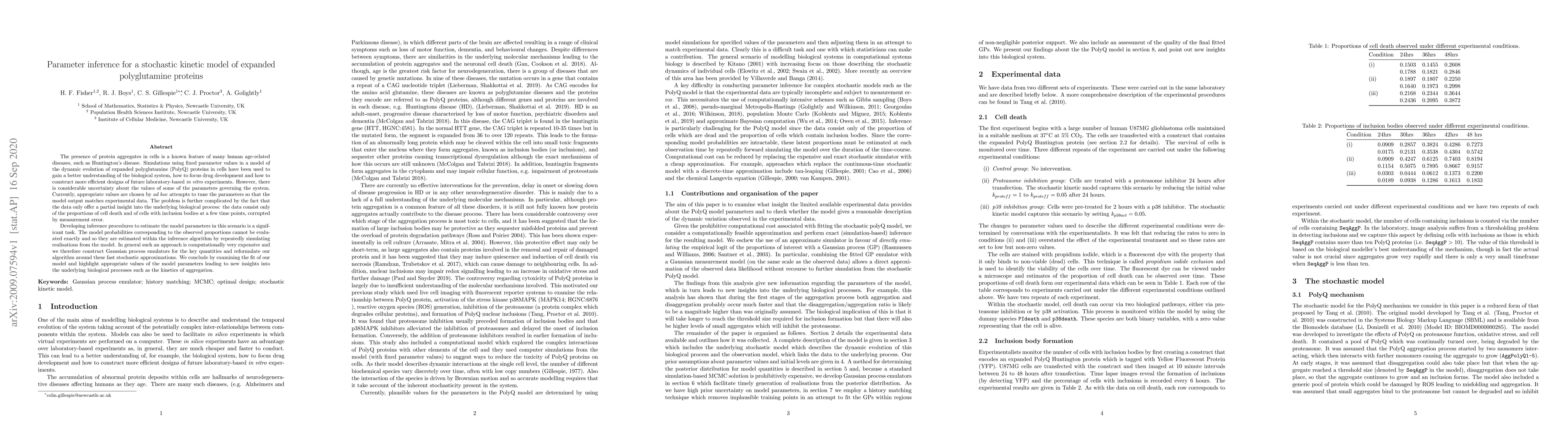 The presence of protein aggregates in cells is a known feature of many human age-related diseases, such as Huntington's disease. Simulations using fixed parameter values in a model of the dynamic evolution of expanded polyglutamine (PolyQ) proteins in cells have been used to gain a better understanding of the biological system, how to focus drug development and how to construct more efficient designs of future laboratory-based in vitro experiments. However, there is considerable uncertainty about the values of some of the parameters governing the system. Currently, appropriate values are chosen by ad hoc attempts to tune the parameters so that the model output matches experimental data. The problem is further complicated by the fact that the data only offer a partial insight into the underlying biological process: the data consist only of the proportions of cell death and of cells with inclusion bodies at a few time points, corrupted by measurement error. Developing inference procedures to estimate the model parameters in this scenario is a significant task. The model probabilities corresponding to the observed proportions cannot be evaluated exactly and so they are estimated within the inference algorithm by repeatedly simulating realisations from the model. In general such an approach is computationally very expensive and we therefore construct Gaussian process emulators for the key quantities and reformulate our algorithm around these fast stochastic approximations. We conclude by examining the fit of our model and highlight appropriate values of the model parameters leading to new insights into the underlying biological processes such as the kinetics of aggregation.