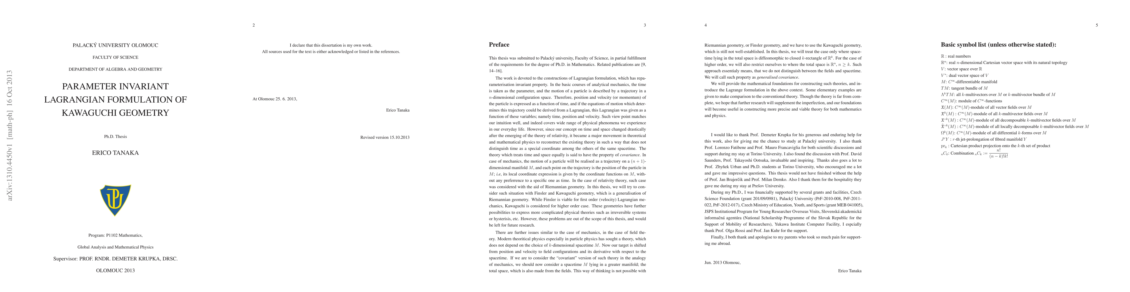 This Ph.D. thesis is devoted to the constructions of Lagrangian formulation on Finsler and Kawaguchi manifolds. While Finsler geometry is a natural extension of Riemannian geometry, Kawaguchi geometry is the extension of Finsler geometry to higher order derivatives and to k-dimensional parameter space. The latter extension is also called areal geometry in some references. On Finsler (Kawaguchi) manifold, we can define a reparameterisation invariant 1 (k)-dimensional area by the Hilbert (Kawaguchi) form, which we take as an action. The equation of motion obtained from such action also has the property of reparameterisation invariance. In this framework, the solution manifold of the Euler-Lagrange equation is realised as a submanifold of Finsler/Kawaguchi manifold, and no fibered structure over the parameter space is needed. We also show that for the case of first order k-dimensional parameter space and second order 1-dimensional parameter space, a global Lagrangian could be constructed. For second order k-dimensional parameter space, Lagrangian is not global but it still has the reparameterisation invariant property. Such theory is expected to provide the ideal stage for formulating fundamental theories of physics, especially for cases such as when one needs to consider the mixing of spacetime and field variables. It is shown that locally, any conventional Lagrangian could be reformulated by the parameter independent Lagrangian. Furthermore, the parameter independent property will gives us the freedom of choosing a parameter, which in some cases turns out to be useful in finding solutions and symmetries.