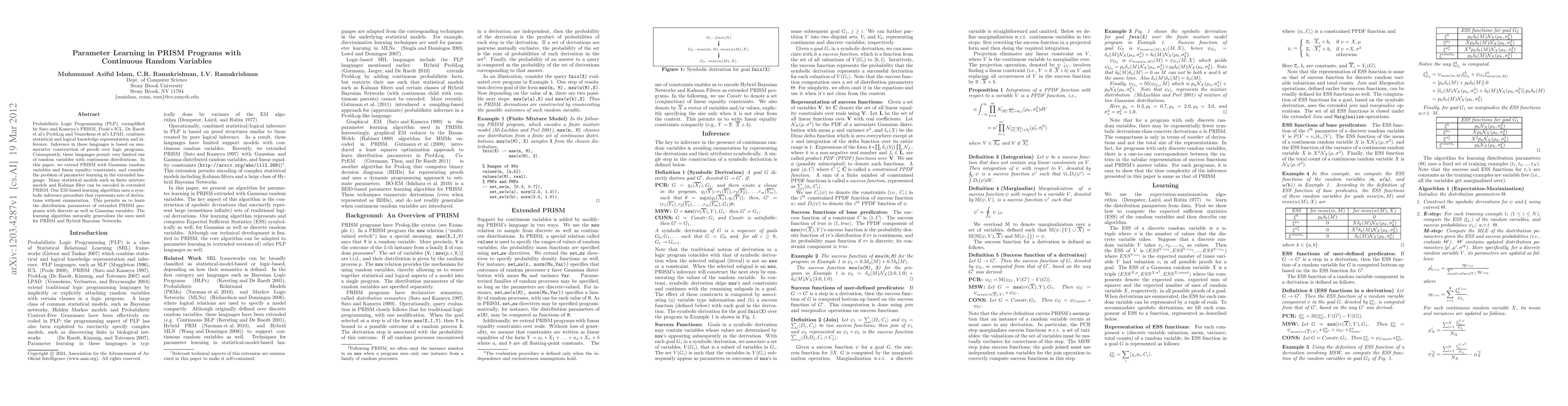 This paper extends PRISM, a Probabilistic Logic Programming language, to incorporate Gaussian random variables and linear equality constraints, enabling the encoding of complex statistical models like mixture models and Kalman filters. An EM-based parameter learning algorithm is proposed, utilizing symbolic inference to efficiently learn the distribution parameters in the extended framework.