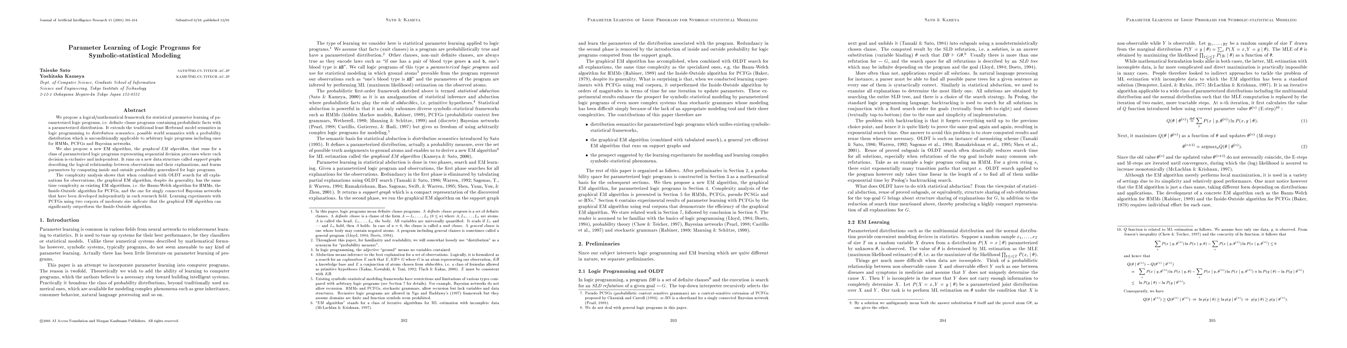 This paper introduces a framework for statistical parameter learning in parameterized logic programs using distribution semantics, extending traditional logic programming. It proposes a new graphical EM algorithm that efficiently learns parameters for sequential decision processes, achieving comparable complexity to existing algorithms like the Baum-Welch and Inside-Outside algorithms, and demonstrating superior performance in learning experiments with PCFGs.