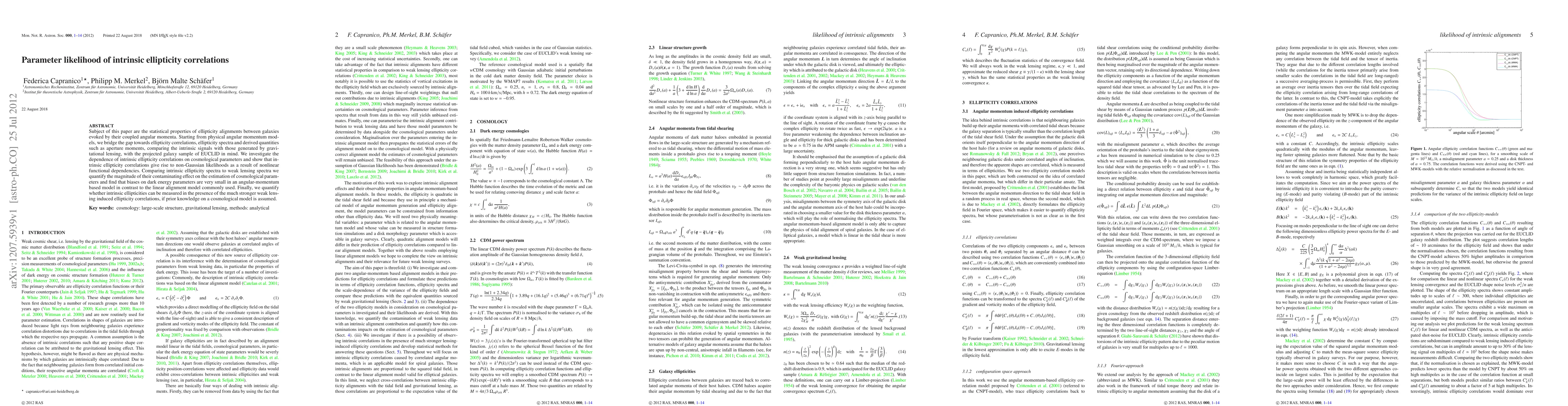 This paper investigates the statistical properties of intrinsic ellipticity alignments between galaxies due to their angular momenta, comparing these to gravitational lensing effects. It finds that intrinsic ellipticity correlations lead to non-Gaussian likelihoods and minimal biases on dark energy parameters, suggesting they can be measured despite stronger lensing effects when prior cosmological knowledge is used.