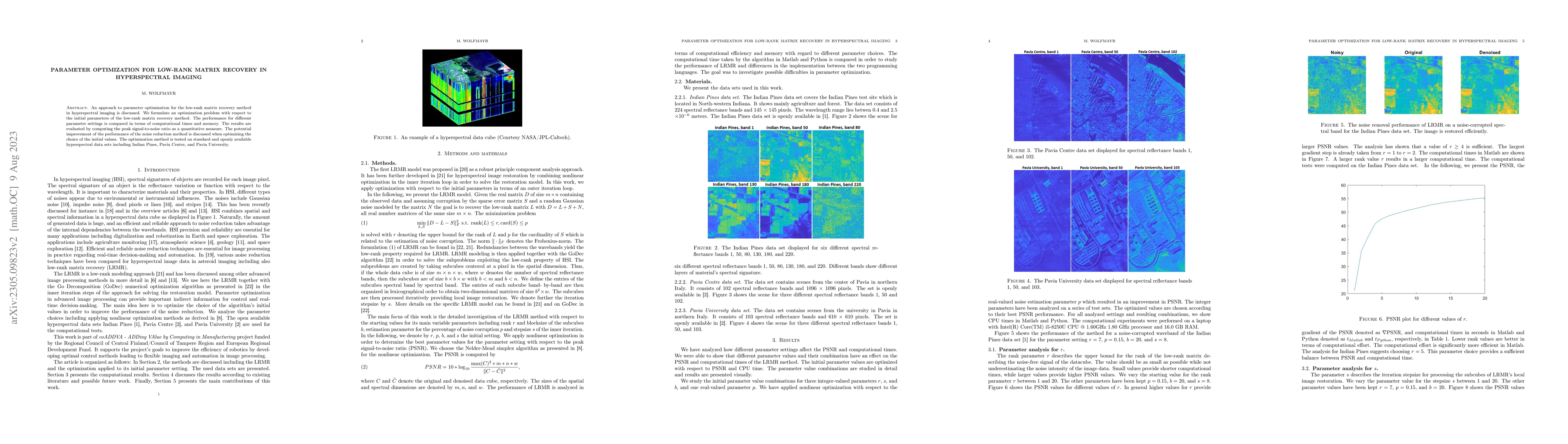 This paper discusses parameter optimization for low-rank matrix recovery in hyperspectral imaging, comparing different parameter settings based on computational times, memory usage, and peak signal-to-noise ratio. The study evaluates the potential performance improvements from optimizing initial parameter values using standard hyperspectral datasets.