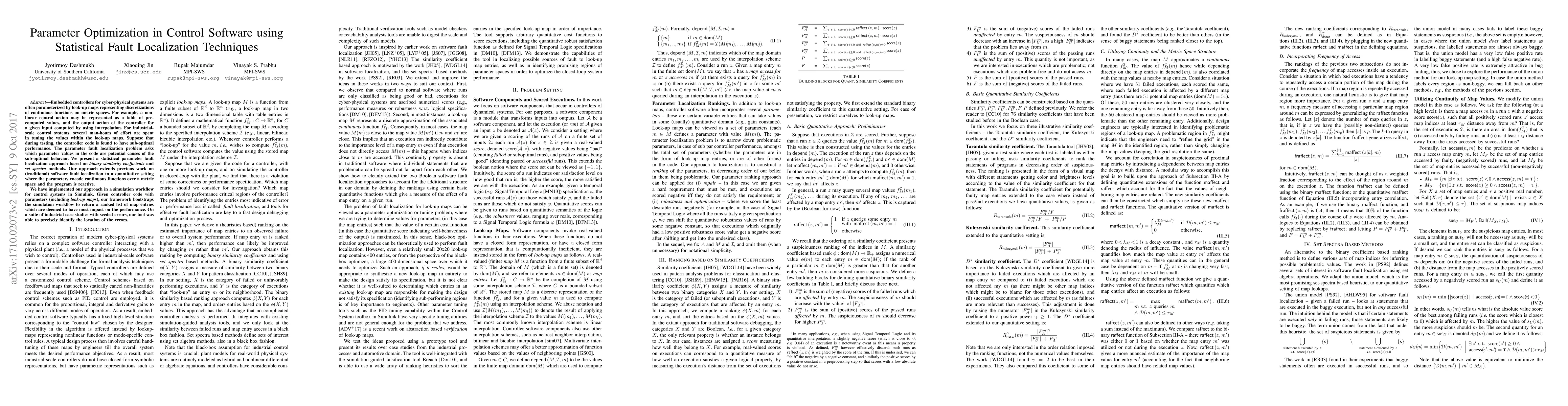Embedded controllers for cyber-physical systems are often parameterized by look-up maps representing discretizations of continuous functions on metric spaces. For example, a non-linear control action may be represented as a table of pre-computed values, and the output action of the controller for a given input is computed by using interpolation. For industrial-scale control systems, several man-hours of effort is spent in tuning the values within the look-up maps, and sub-optimal performance is often associated with inappropriate values in look-up maps. Suppose that during testing, the controller code is found to have sub-optimal performance. The parameter fault localization problem asks which parameter values in the code are potential causes of the sub-optimal behavior. We present a statistical parameter fault localization approach based on binary similarity coefficients and set spectra methods. Our approach extends previous work on software fault localization to a quantitative setting where the parameters encode continuous functions over a metric space and the program is reactive. We have implemented our approach in a simulation workflow for automotive control systems in Simulink. Given controller code with parameters (including look-up maps), our framework bootstraps the simulation workflow to return a ranked list of map entries which are deemed to have most impact on the performance. On a suite of industrial case studies with seeded errors, our tool was able to precisely identify the location of the errors.