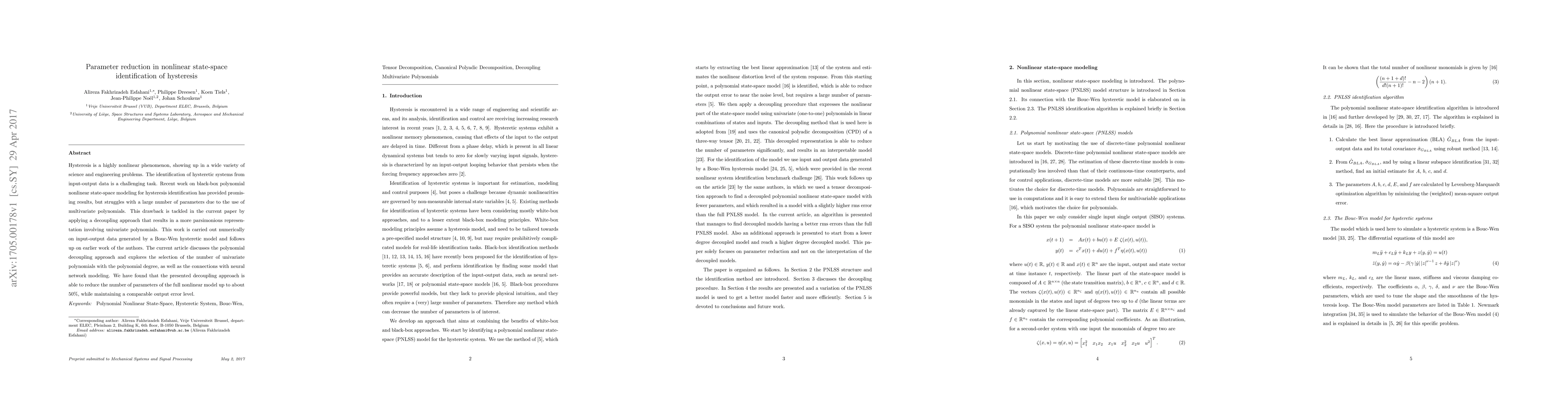 This paper proposes a decoupling approach to reduce the number of parameters in identifying hysteretic systems using polynomial nonlinear state-space modeling, achieving up to 50% reduction while maintaining output accuracy, compared to traditional multivariate polynomial methods. The approach uses univariate polynomials and is numerically tested on Bouc-Wen hysteretic models.
