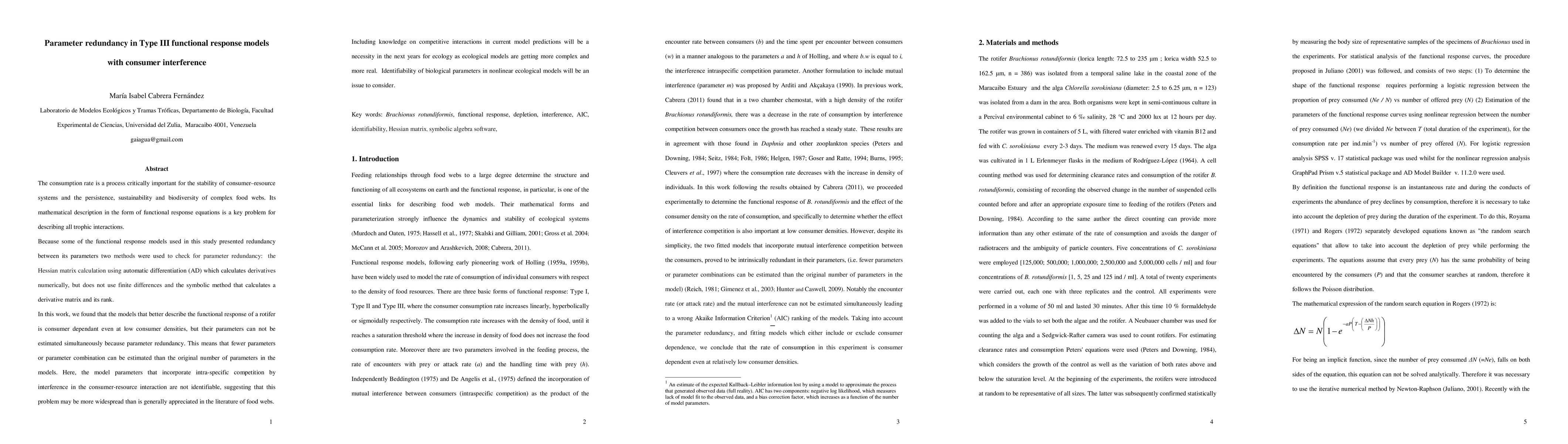 The consumption rate is a process critically important for the stability of consumer-resource systems and the persistence, sustainability and biodiversity of complex food webs. Its mathematical description in the form of functional response equations is a key problem for describing all trophic interactions. Because some of the functional response models used in this study presented redundancy between its parameters two methods were used to check for parameter redundancy: the Hessian matrix calculation using automatic differentiation (AD) which calculates derivatives numerically, but does not use finite differences, and the symbolic method that calculates a derivative matrix and its rank. In this work, we found that the models that better describe the functional response of a rotifer is consumer dependant even at low consumer densities, but their parameters can not be estimated simultaneously because parameter redundancy. This means that fewer parameters or parameter combination can be estimated than the original number of parameters in the models. Here, the model parameters that incorporate intraspecific competition by interference in the consumer-resource interaction are not identifiable, suggesting that this problem may be more widespread than is generally appreciated in the literature of food webs. Including knowledge on competitive interactions in current model predictions will be a necessity in the next years for ecology as ecological models are getting more complex and more real. Identifiability of biological parameters in nonlinear ecological models will be an issue to consider.