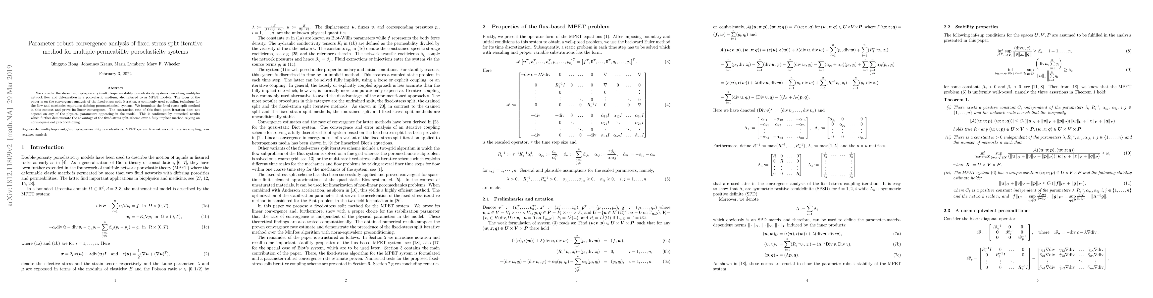 This paper presents a convergence analysis for the fixed-stress split iterative method applied to multiple-permeability poroelasticity systems. It proves linear convergence with a contraction rate independent of physical parameters, supported by numerical results showing the method's advantage over norm-equivalent preconditioned fully implicit methods.