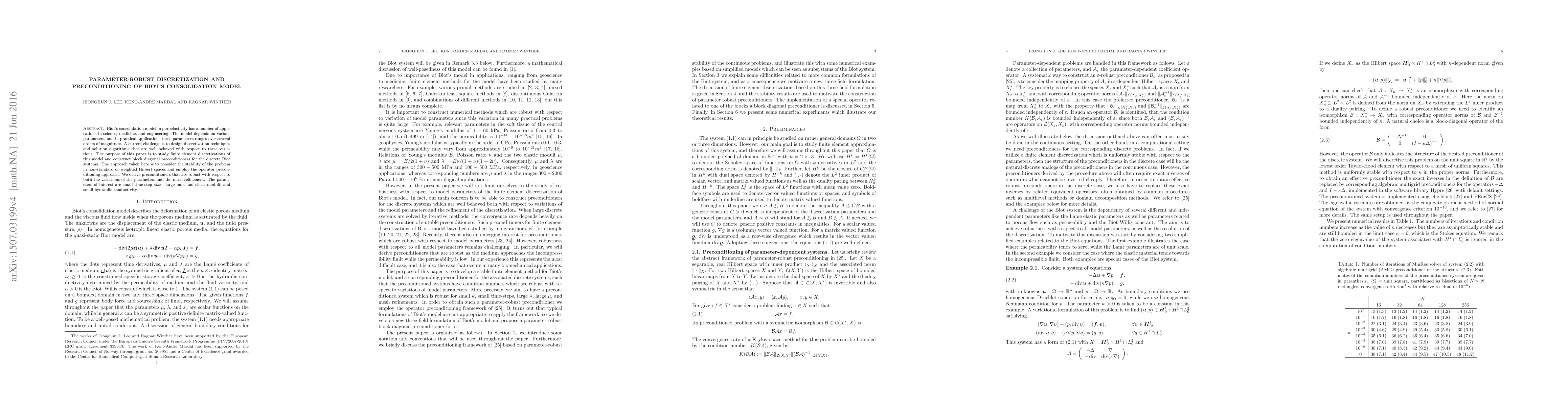 This paper develops robust finite element discretizations and preconditioners for Biot's consolidation model, addressing parameter variations over several orders of magnitude. It employs operator preconditioning in non-standard Hilbert spaces to achieve stability and robustness with respect to small time-step sizes, large moduli, and small hydraulic conductivity.