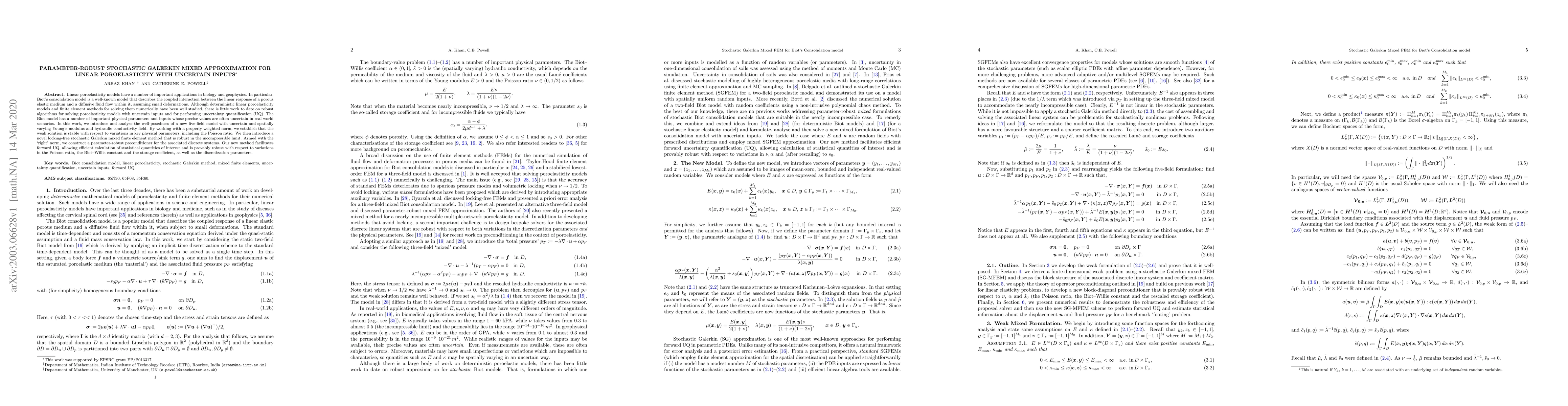 Linear poroelasticity models have a number of important applications in biology and geophysics. In particular, Biot's consolidation model is a well-known model that describes the coupled interaction between the linear response of a porous elastic medium and a diffusive fluid flow within it, assuming small deformations. Although deterministic linear poroelasticity models and finite element methods for solving them numerically have been well studied, there is little work to date on robust algorithms for solving poroelasticity models with uncertain inputs and for performing uncertainty quantification (UQ). The Biot model has a number of important physical parameters and inputs whose precise values are often uncertain in real world scenarios. In this work, we introduce and analyse the well-posedness of a new five-field model with uncertain and spatially varying Young's modulus and hydraulic conductivity field. By working with a properly weighted norm, we establish that the weak solution is stable with respect to variations in key physical parameters, including the Poisson ratio. We then introduce a novel locking-free stochastic Galerkin mixed finite element method that is robust in the incompressible limit. Armed with the `right' norm, we construct a parameter-robust preconditioner for the associated discrete systems. Our new method facilitates forward UQ, allowing efficient calculation of statistical quantities of interest and is provably robust with respect to variations in the Poisson ratio, the Biot--Willis constant and the storage coefficient, as well as the discretization parameters.