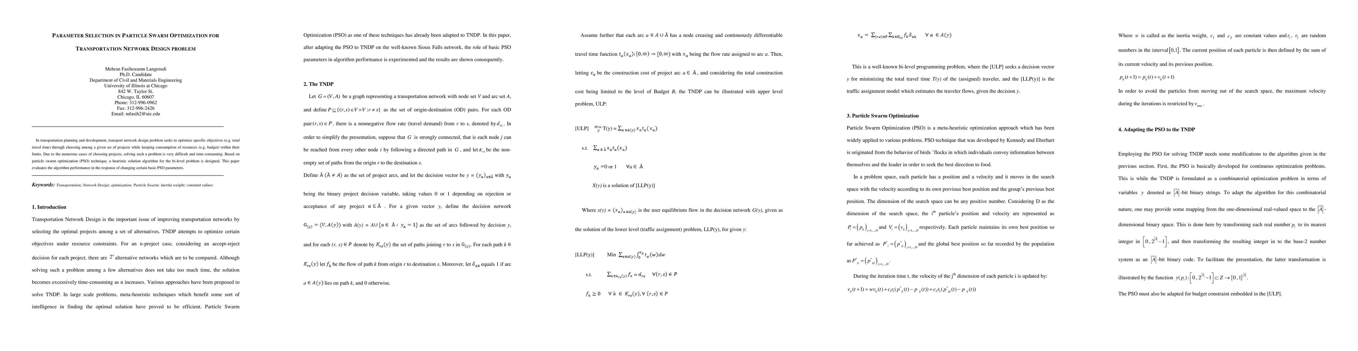 In transportation planning and development, transport network design problem seeks to optimize specific objectives (e.g. total travel time) through choosing among a given set of projects while keeping consumption of resources (e.g. budget) within their limits. Due to the numerous cases of choosing projects, solving such a problem is very difficult and time-consuming. Based on particle swarm optimization (PSO) technique, a heuristic solution algorithm for the bi-level problem is designed. This paper evaluates the algorithm performance in the response of changing certain basic PSO parameters.