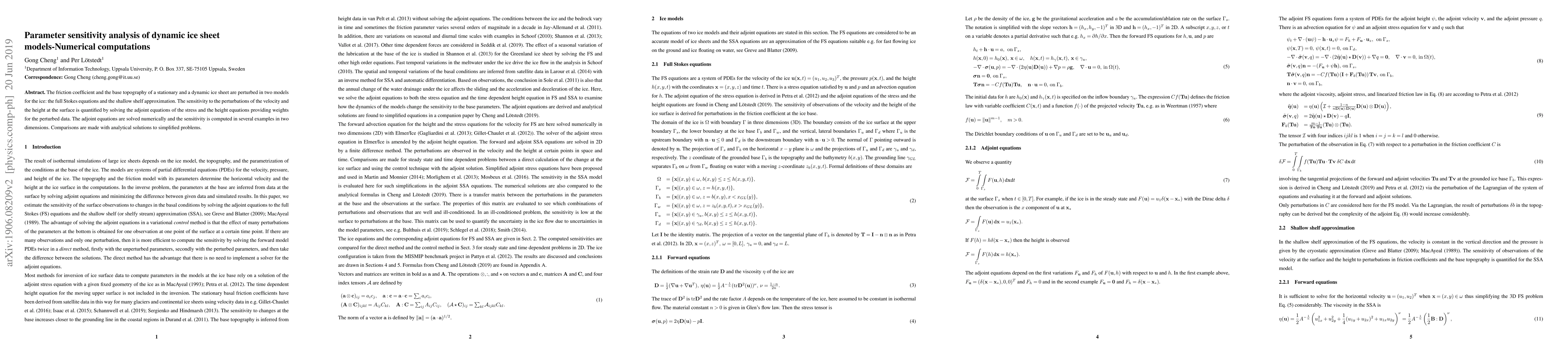 This paper conducts a parameter sensitivity analysis of dynamic ice sheet models using numerical computations, focusing on the friction coefficient and base topography. It employs adjoint equations to quantify the sensitivity of velocity and surface height to perturbations in two-dimensional models based on the full Stokes equations and the shallow shelf approximation.