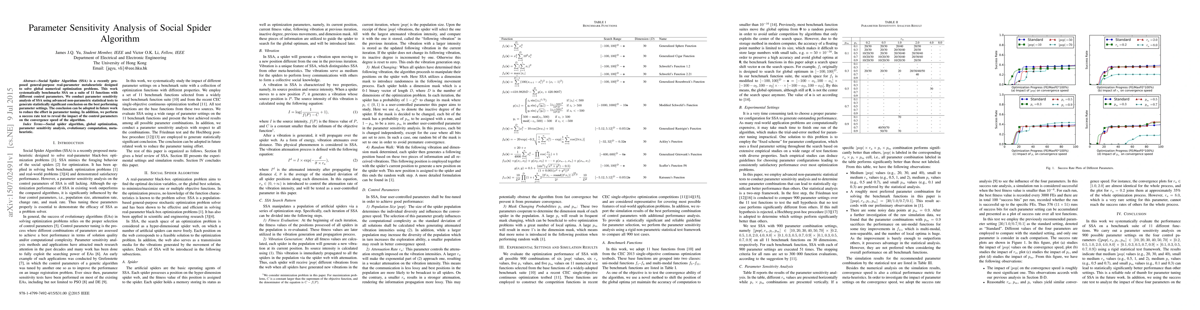 This paper conducts a parameter sensitivity analysis of the Social Spider Algorithm (SSA) using non-parametric statistical tests, identifying optimal parameter settings for improved performance. It also evaluates the impact of control parameters on SSA's convergence speed through success rate tests.
