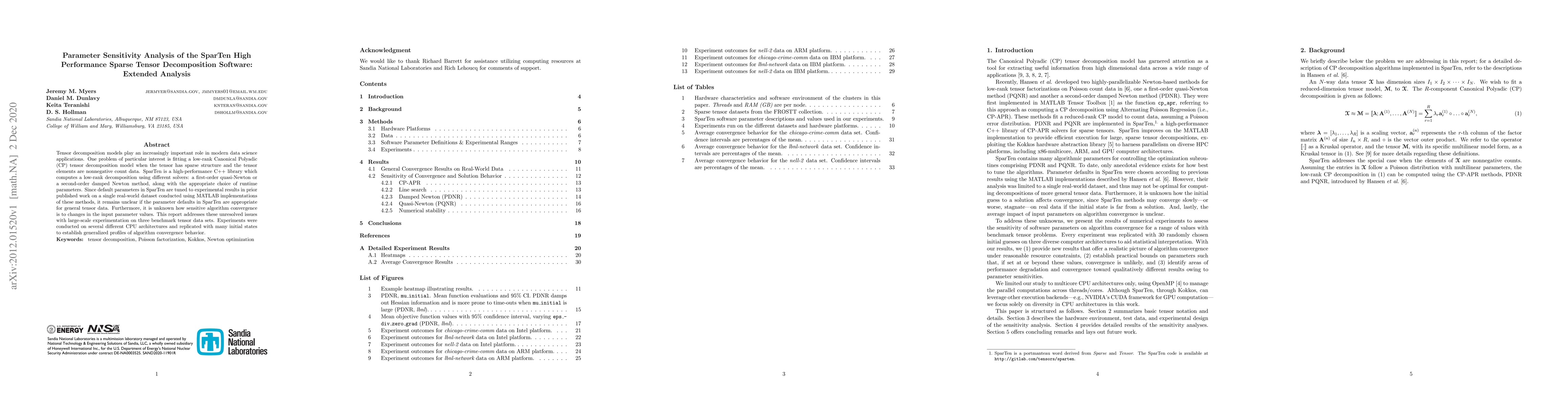 This paper conducts a parameter sensitivity analysis of the SparTen library for sparse tensor decomposition, examining how default parameters affect algorithm convergence across various datasets and CPU architectures. The study aims to determine the robustness of the library's performance and the generalizability of its parameter settings.