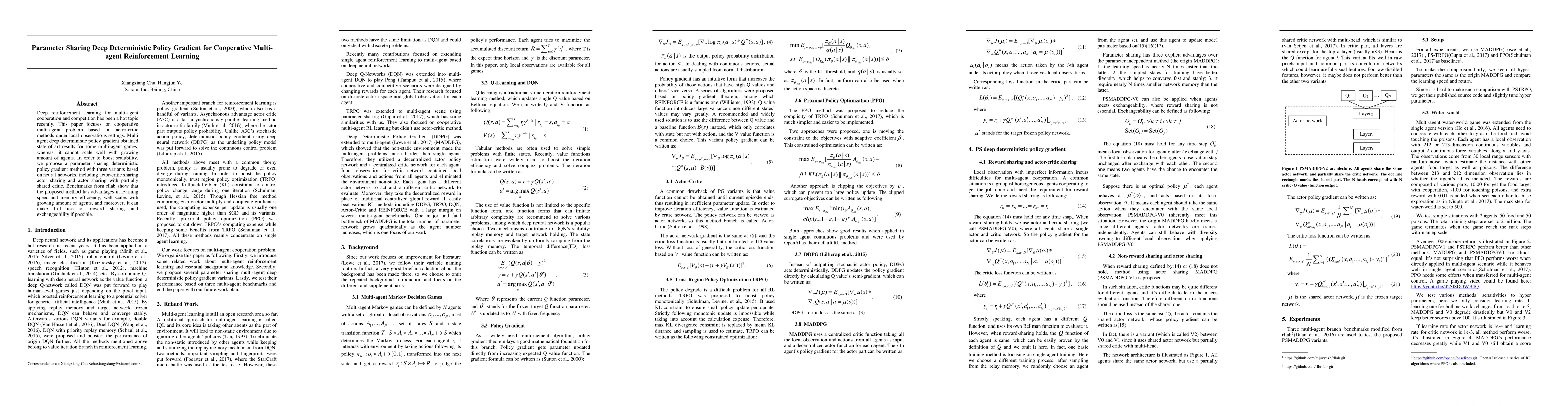 This paper proposes a parameter sharing deep deterministic policy gradient method to improve scalability in cooperative multi-agent reinforcement learning, achieving better learning speed, memory efficiency, and scalability with growing agent numbers compared to traditional methods. Benchmarks show its advantages in utilizing reward sharing and exchangeability.